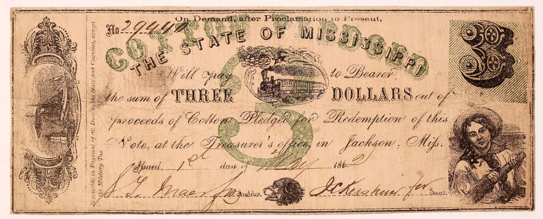 Mississippi Criswell 19, 1862 $3 Confederate currency. Choice fine condition.