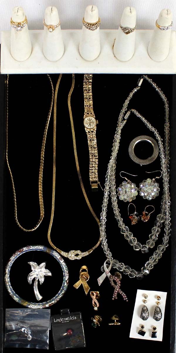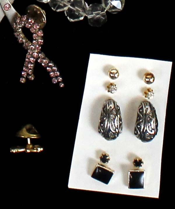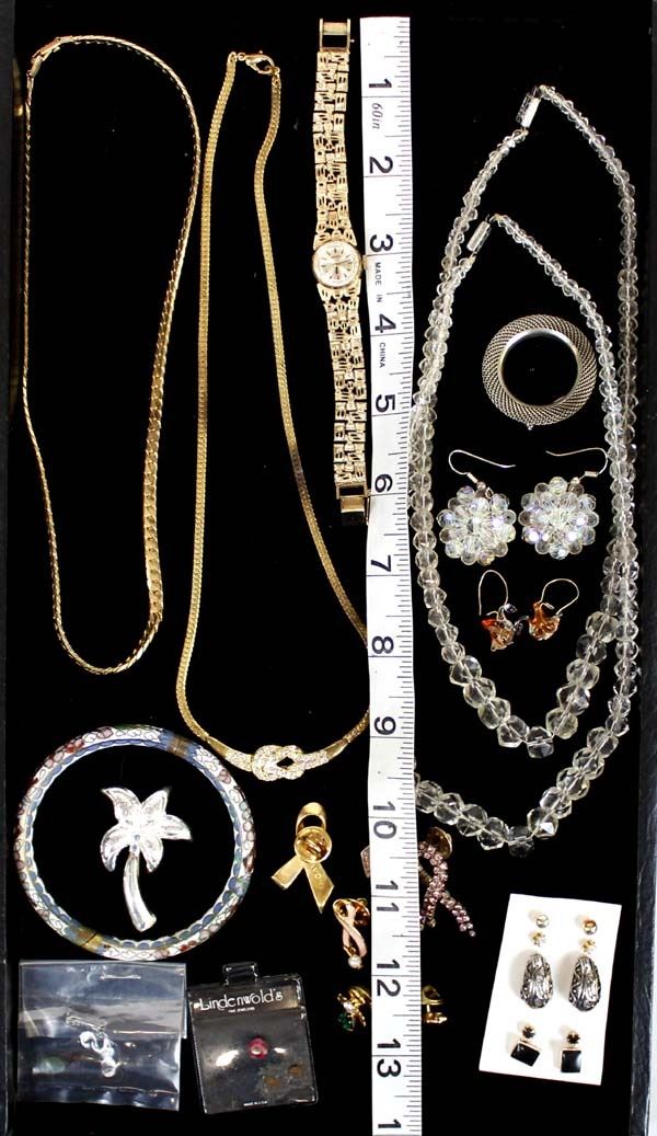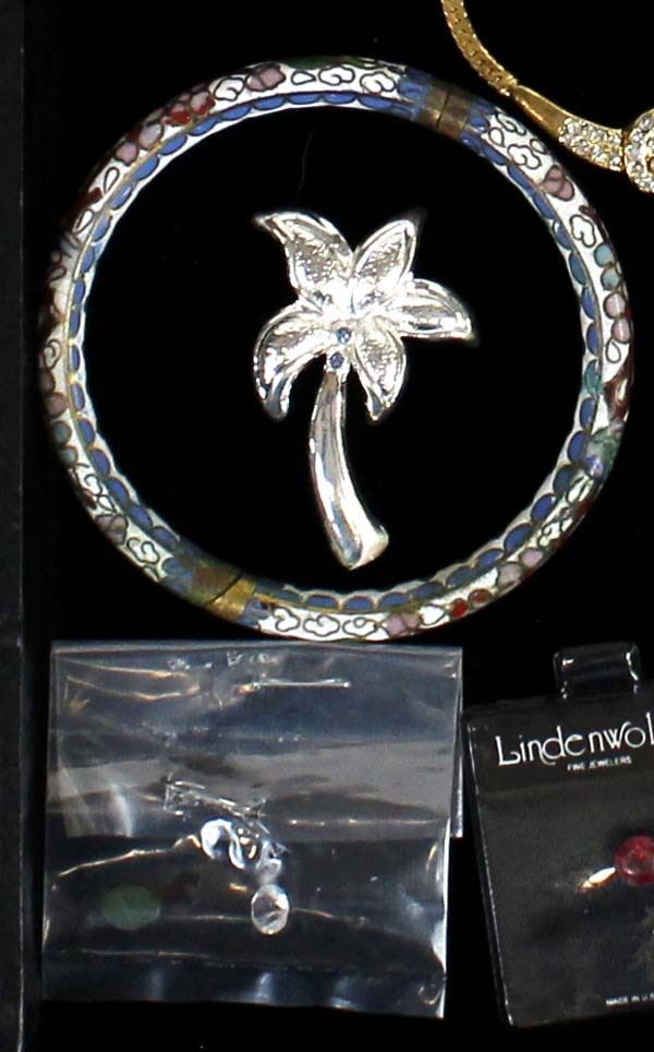 Mississippi Estate Jewelry Collection. We have 7 pair of earrings, 1 cloisonné bangle bracelet, 1 Seiko watch, 6 rings, 4 small stones, & 8 pins. 5 of these pieces are marked Sterling Silver, 3 of the rings are marked 18K Gold Electroplate, longest necklace measures 18"L end to end