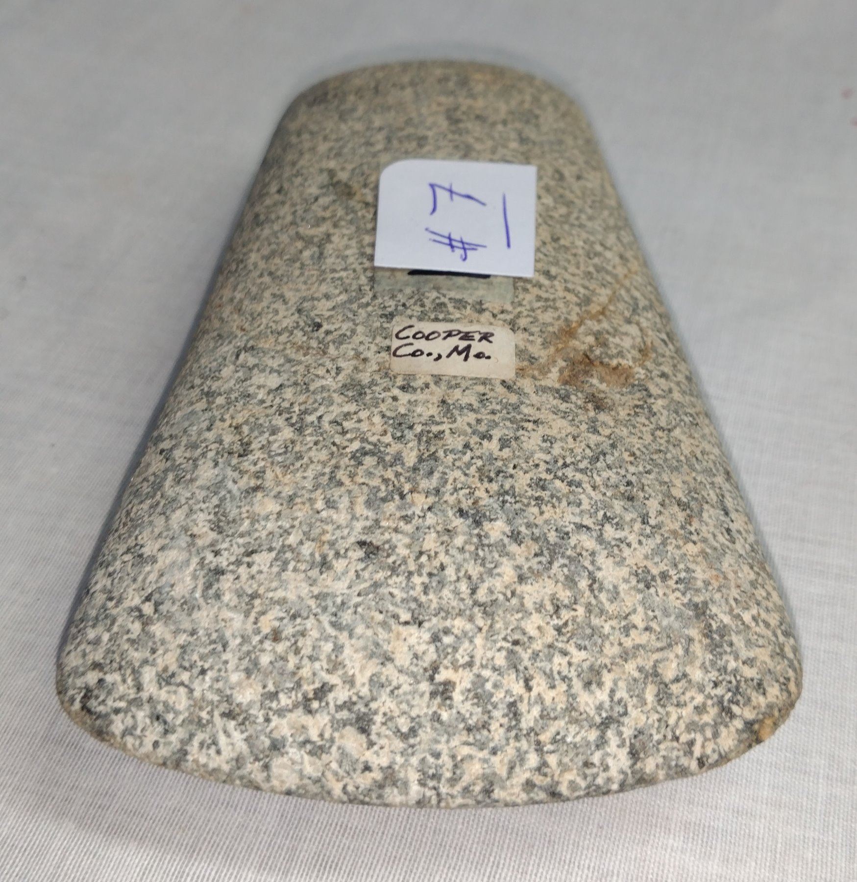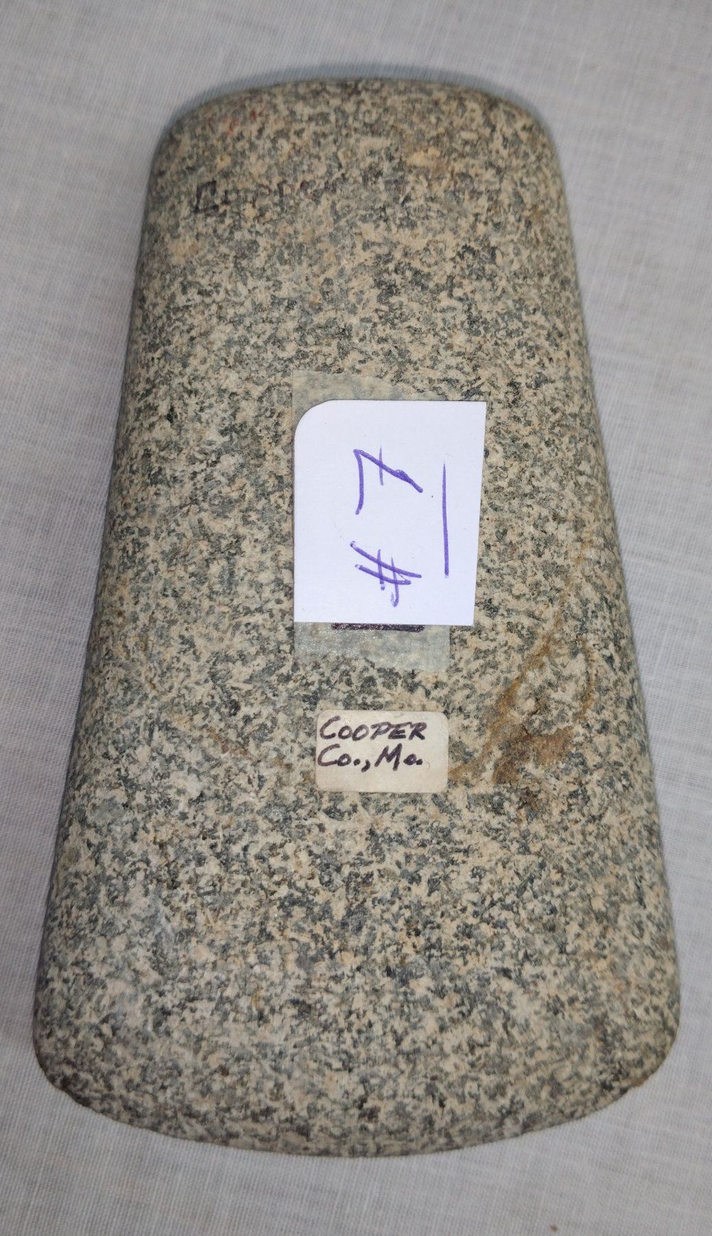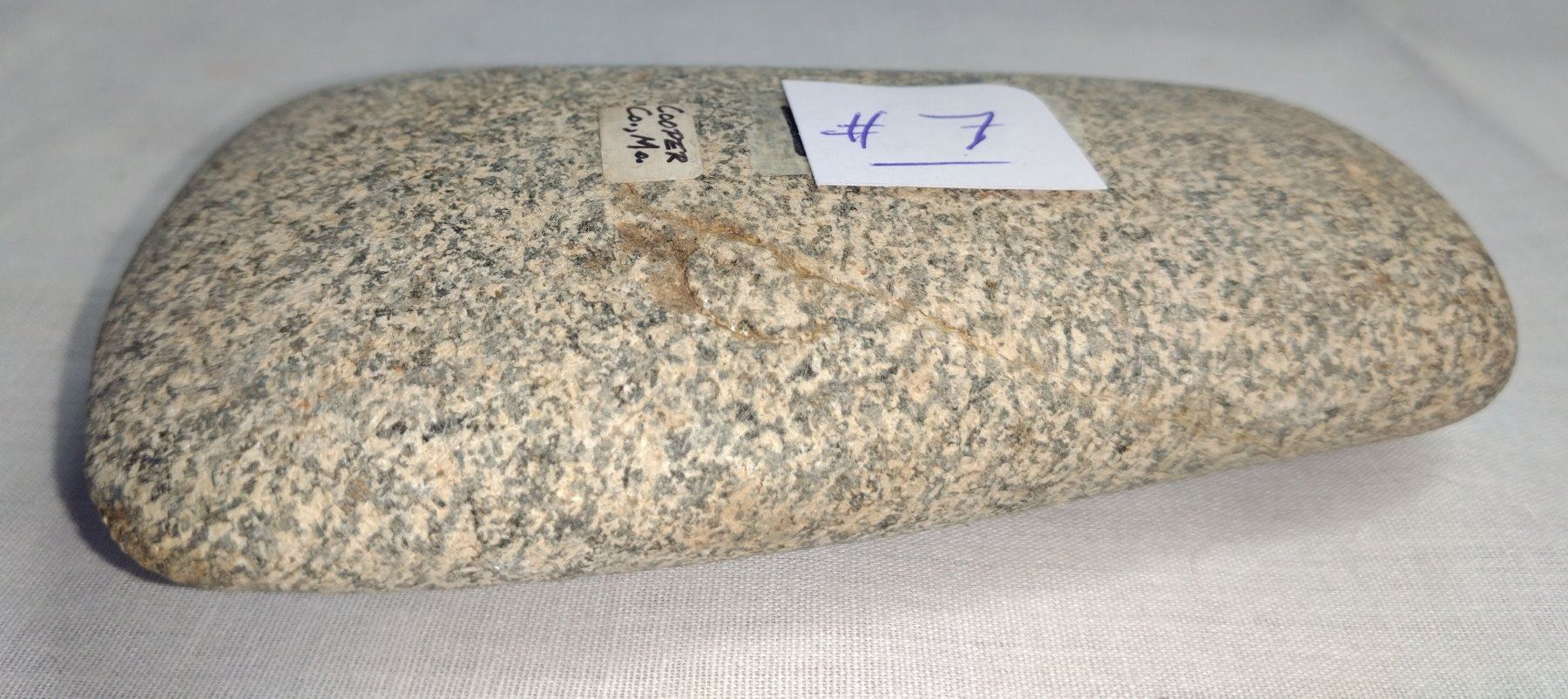 Missouri Celt, pre-historic item. Made of black and white granite, the item measures 5 1/2" x 3 1/4". Cooper County, Missouri. Fine celt. Condition: Good, see images. Shipping: $18.50 w/insurance and signature.