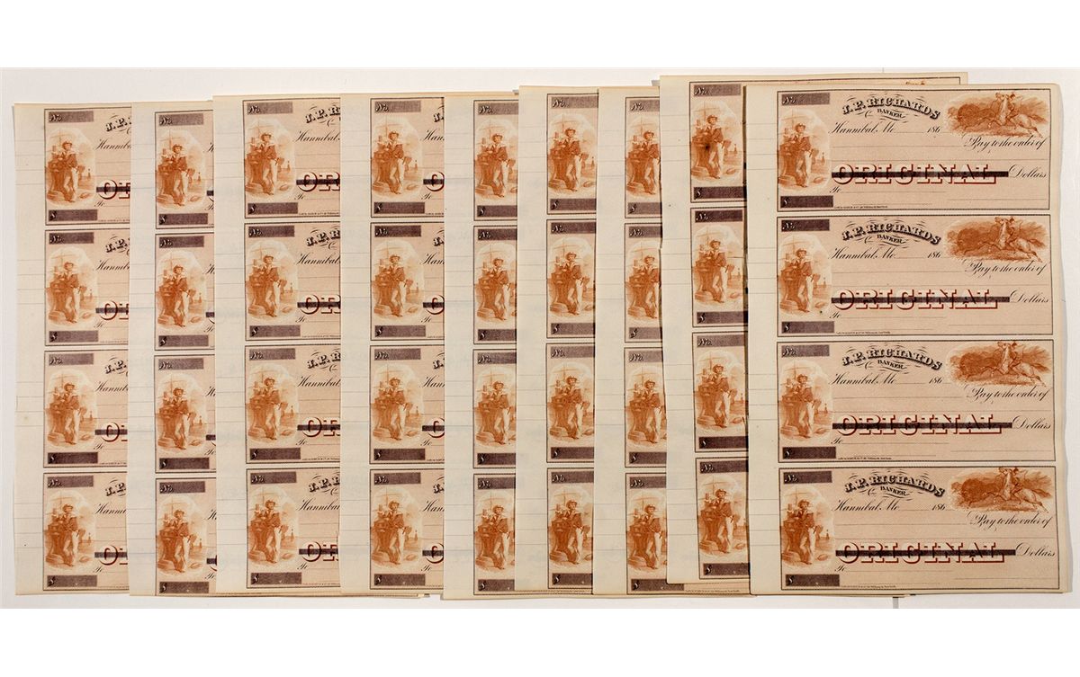 c1860 Lot of 21 sheets, with 4 unissued Exchange checks per sheet. These are from "J.P. Richards, Banker." There are 2 vignettes, 1 on each side depicting a tradesman, and an Indian on horseback hunting buffalo. The litho was printed by Hatch & Co. 29 William St. New York. Each sheet measures 9"x15". The sheets are all in excellent condition. Hannibal was the 3rd largest city in Missouri at the time, and the boyhood home of Samuel Clemens, aka Mark Twain. - HKA#65244