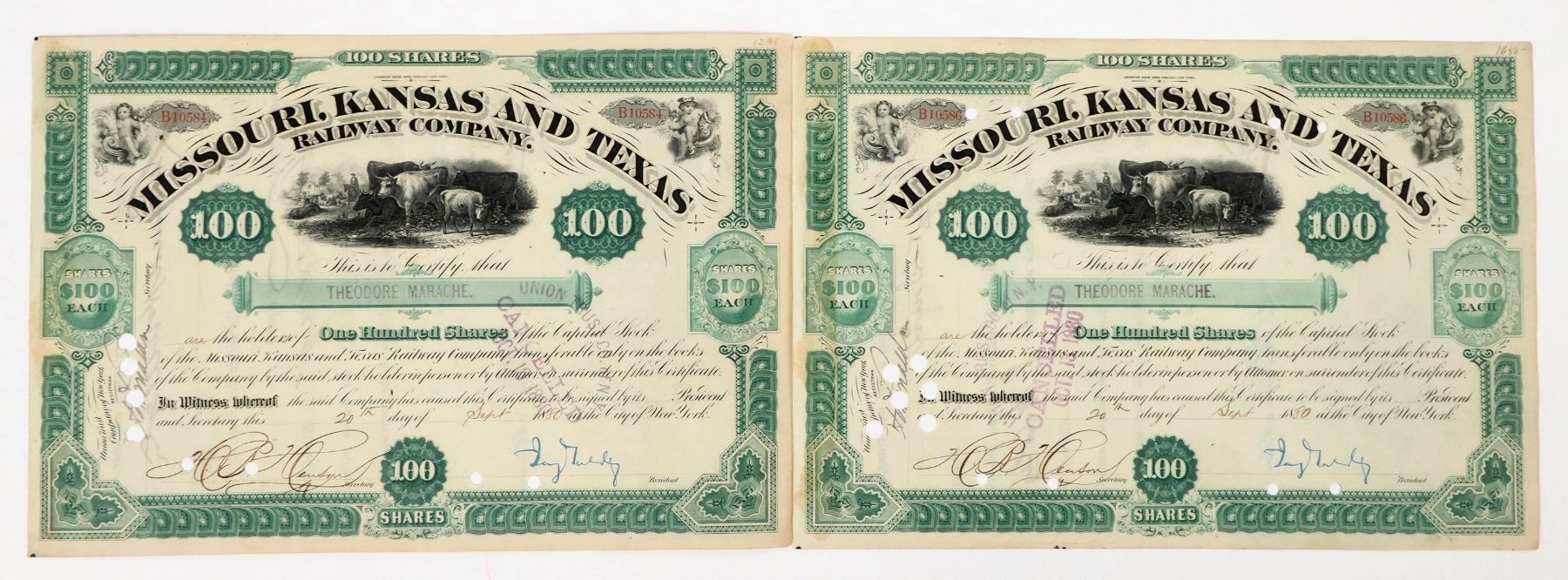 Lot of 2 stocks issued in 1880. Both signed by Jay Gould as president, punch cancelled but signatures unaffected. Jay Gould (1836–1892) was an American railroad magnate and financier widely regarded as one of the most ruthless "robber barons" of the Gilded Age. He gained control of several major railroads, including the Union Pacific and the Erie Railroad, often using aggressive and controversial tactics such as stock manipulation and bribery. Despite public criticism, Gould amassed immense wealth and influence, leaving a legacy of both industrial expansion and ethical controversy in American business history.