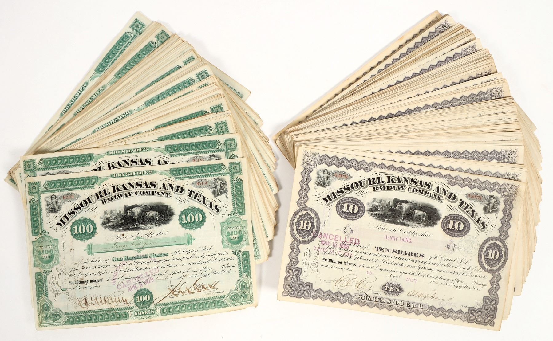 Approx. 90. I/C. Issued 1878-85 VG or better. Missouri, Kansas and Texas Railway Co. Stocks., two varieties.