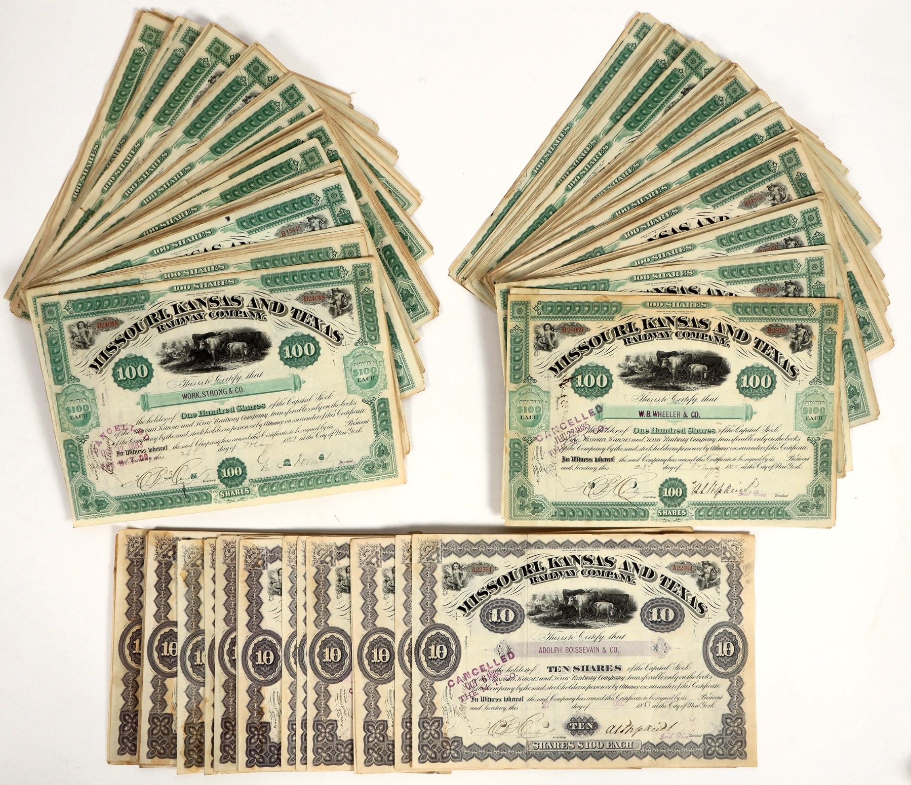 Approx. 150. I/C. Issued 1878-85 VG or better. Missouri, Kansas and Texas Railway Co. Stocks, ,two varieties.