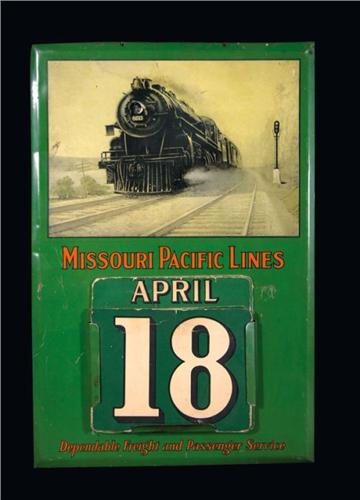 Missouri Pacific Lines Perpetual Calendar, tin over cardboard. Minor dents and scratches otherwise good original condition. 13 X 19 inches.