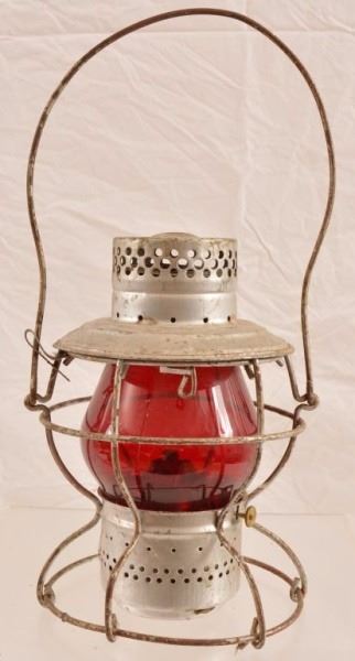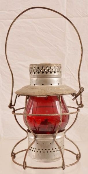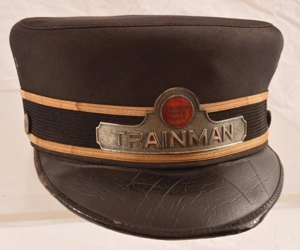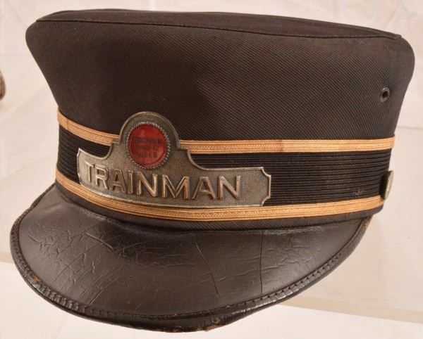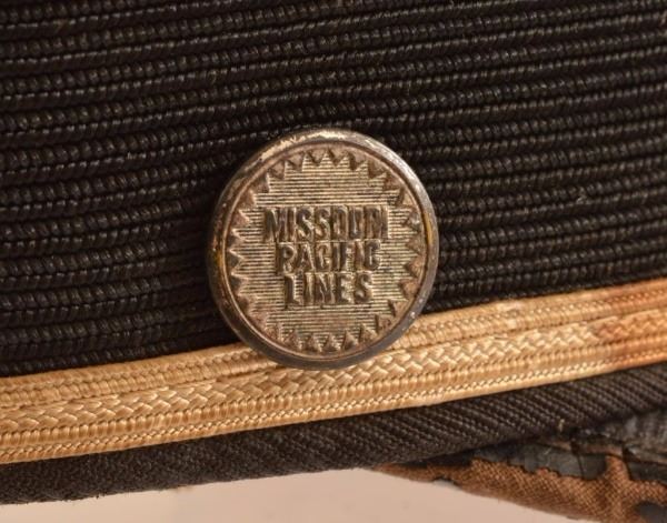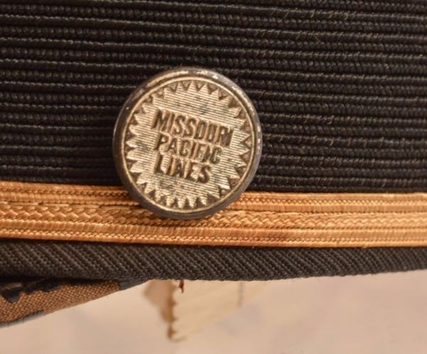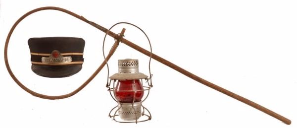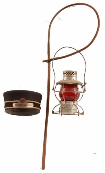 Missouri Pacific Railroad Trainman's hat in original box, railroad lamp, and Train Order Hoop.