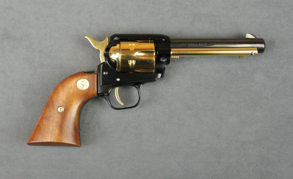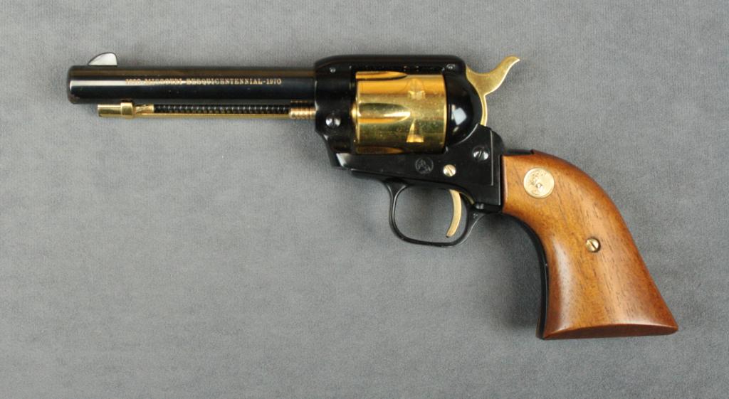 Missouri Sesquicentennial Commemorative Colt  Frontier Scout SAA revolver, .22LR cal.,  4-3/4” barrel, blue and gold wash finish,  smooth medallion wood grips, #OMOS in factory  cardboard box. This gun is in overall fineto excellent condition showing the majority  of its original finish with a spot of surface  rust and erosion on the left side of the  muzzle; fine bore, markings, action and  grips. This gun was produced in 1970 with atotal number of 3,000 made.  Given the  unusual serial number, this may have been  from the personal collection of George A.  Strichman, previous President of Colt  Firearms; should be further researched.Est.:  $400-$800.