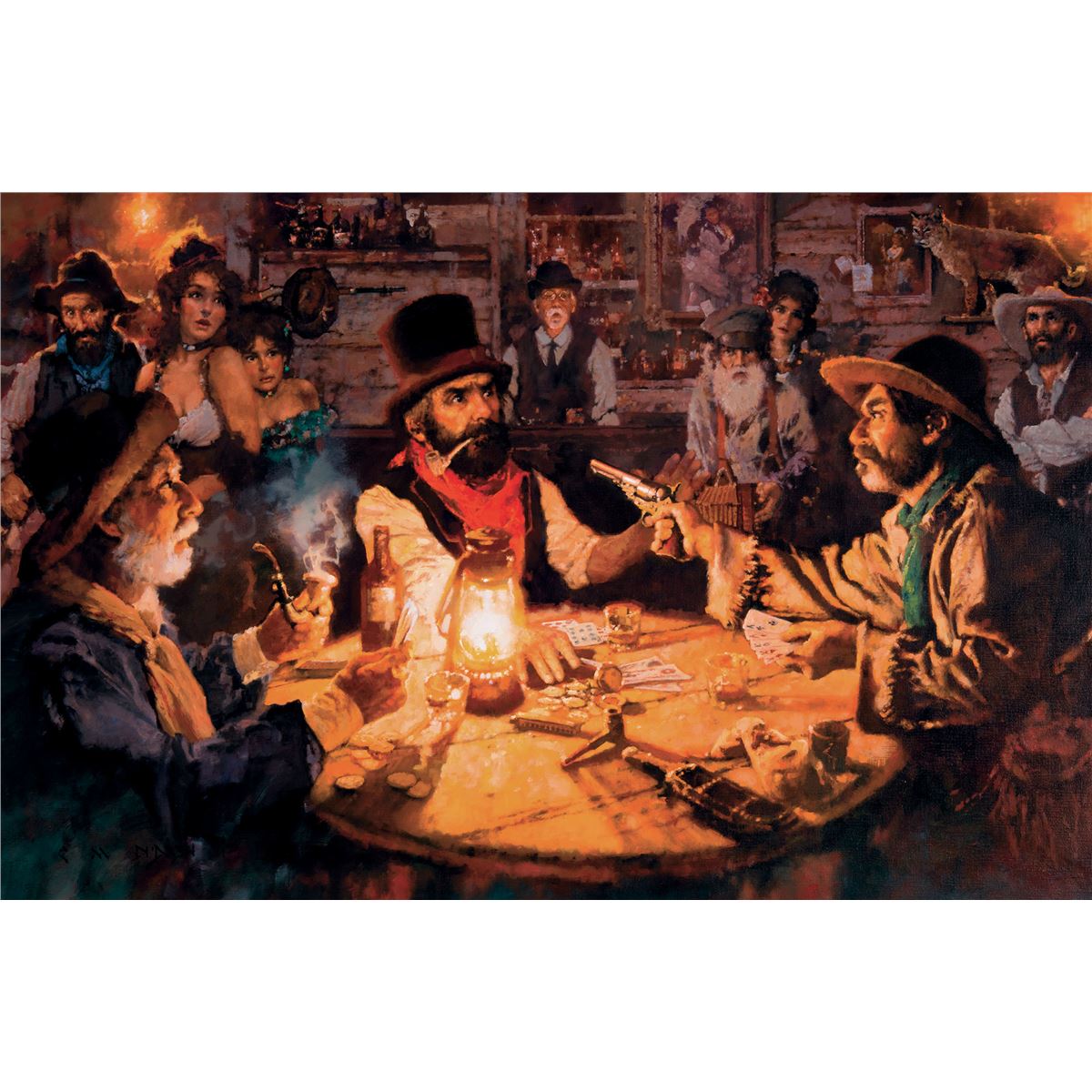 Mister, a Full House and a Colt Beats Four of a Kind Everytime kind of sums up the predicament in Michael DudashÕs light-heartedÑas long as youÕre not the fellow in the tall beaverÑlook at one of the central motifs in the lore of the Old West: the card game in the saloon. EverybodyÕs on tenterhooks, the dance hall girls, the other patrons, the bartendersÑeven the stuffed bobcat and the women in the clever paintings behind the barÑwondering how the other shoe will drop. The lantern provides just enough illumination to draw the viewerÕs eye, like a moth to a flame, to the glint on the six-gun barrel.