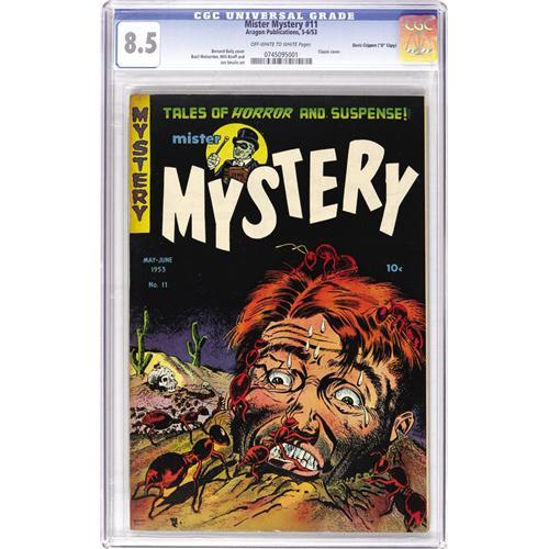 <B>Mister Mystery #11 Davis Crippen ("D" Copy) pedigree (Aragon Magazines, Inc., 1953) CGC VF+ 8.5 Off-white to white pages.</B></I> In the '40s, artist Bernard Baily gave little inkling of the edgy artwork he would be creating a decade later. His covers for this infamous title provided unexpected chills to those who associated him more with his earlier DC work. This is one of his most famous, and certainly raised the ire of Dr. Fredric Wertham! Basil Wolverton contributed interior art for this issue. Overstreet 2006 VF 8.0 value = $506; VF/NM 9.0 value = $803. CGC census 7/06: 1 in 8.5, 2 higher. <I>From the Crippen Collection</B></I>. <BR><BR><B>Important notice:</B> Heritage usually auctions material at the rate of 200-250 lots per hour. On some occasions eBay Live bid software or the Internet may not be able to keep up with the pace of the auction. We recommend placing a realistic absentee bid now as insurance to avoid disappointment. Occasionally the auctioneer may eliminate or reject an eBay Live bid, and the auctioneer may also reopen a lot after the close of the eBay live bidding (usually because we missed an audience bid), and may reject your bid even if it shows you as the winning bidder. By bidding via eBay Live, you agree that Heritage may award the lot to another bidder at its sole discretion under the circumstances described above or any other reasonable circumstances. Since eBay bids are not shown to us until we open the lot on the floor, we treat those bids just like floor bids. In most cases the floor responds before the eBay bid is presented to us, due to Internet lag time, so for consistency we have made it a policy that floor bids are always considered first over tie eBay live bids. Also please note that all Heritage lots purchased through eBay Live carry a 22.5% Buyer's Premium. Please make sure you read the Terms and Conditions before you bid. This lot is being auctioned in conjunction with a live floor auction by Heritage Auction Galleries. All final auction and invoice information will be supplied by Heritage Auction Galleries, and all other information should be considered preliminary. Lot:41001 <BR><BR><B>Winning Notification and Billing:</B> After the FINAL session in this auction is complete, Heritage will send e-mail and snail mail invoices. This process normally takes several days. All final auction and invoice information will be supplied by Heritage Auction Galleries, and all other information should be considered preliminary. <BR><BR>This auction will be conducted on a live auction floor and over the Internet through eBay Live. If you choose to place an absentee bid, please take a moment to <font color='#0000ff'><u><a href='http://pages.ebay.com/liveauctions/help/before/laabsentee.html'>learn how eBay Live absentee bidding works</a></u></font><font color='#000000'>