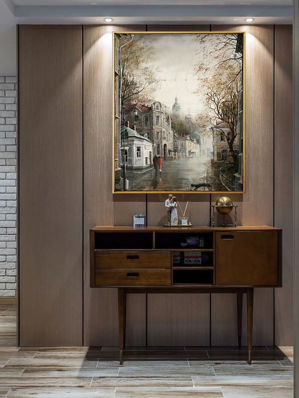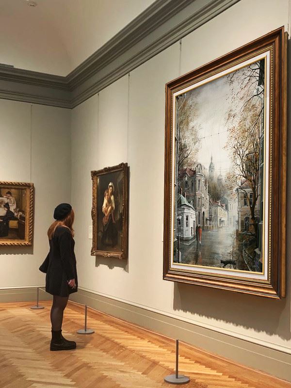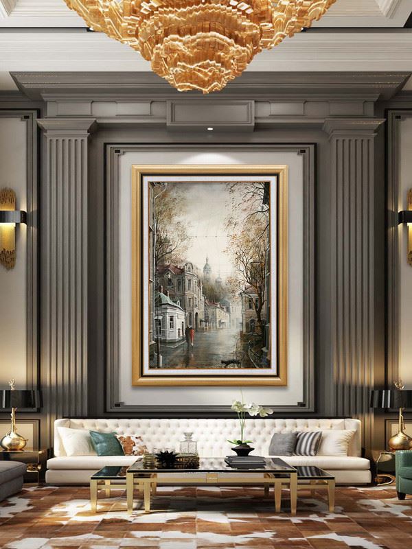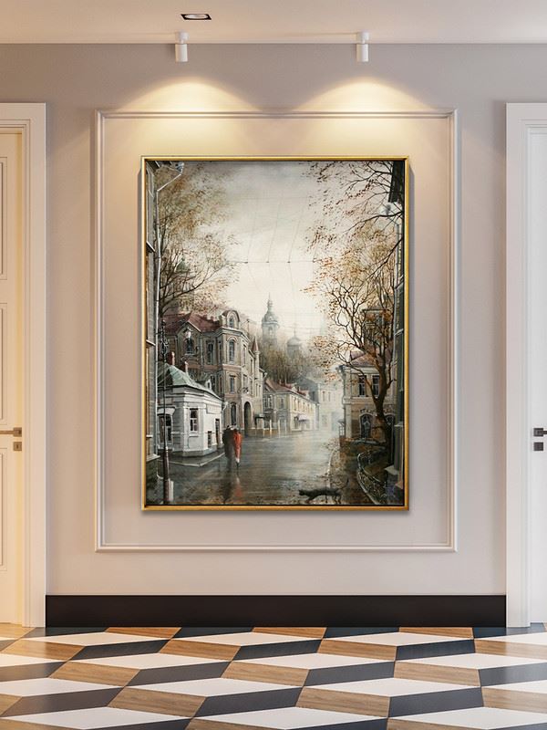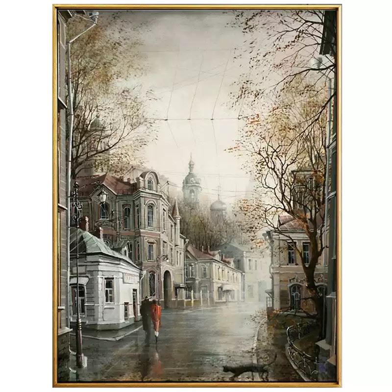 A soft autumn mist settles over the old town street. The wet pavement mirrors the pale sky as a couple walks slowly, while distant church towers fade gently into the haze. Dimensions: 28 x 35 inches.