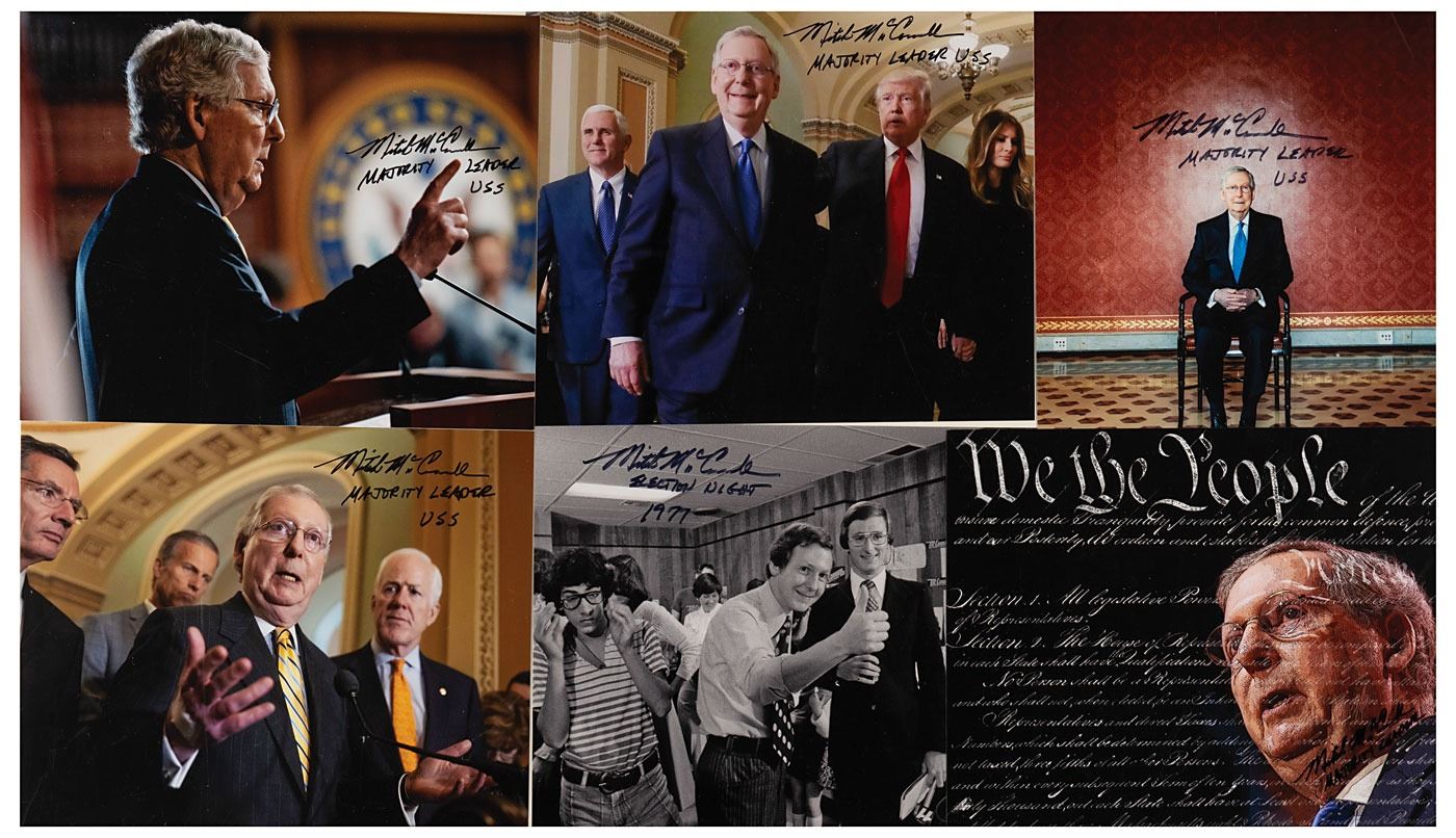 Six glossy 8 x 10 and 10 x 8 photos of Mitch McConnell at various stages of his political career, each signed in black felt tip, with McConnell adding "Majority Leader" to five and "Election Night, 1977" to one. In overall fine condition. Accompanied by a United States Senator business card belonging to McConnell, who has signed in black ink.