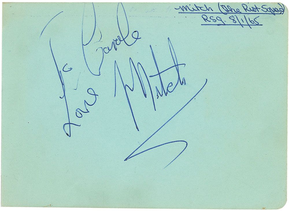 Vintage ballpoint signature and inscription, “To Carole, Love, Mitch,” on a light green 5 x 3.75 album page, with collector’s notations in top right noting signature was acquired while Mitchell was a member of The Riot Squad. In fine condition, with some mild toning and a few light vertical bends.