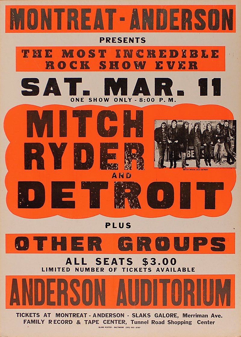 Original color 22 x 31 poster entitled ‘The Most Incredible Rock Show Ever—Mitch Ryder and Detroit.’ In very good condition, with mild creasing, toning and wear, and some areas where the print is a bit worn.