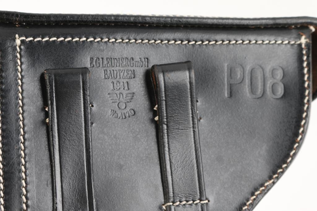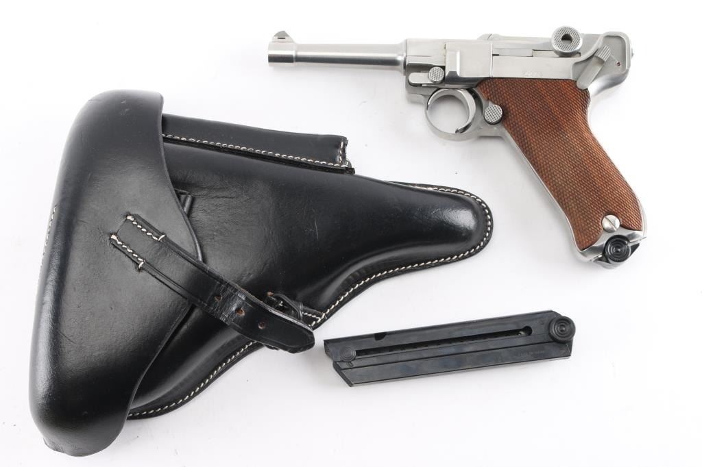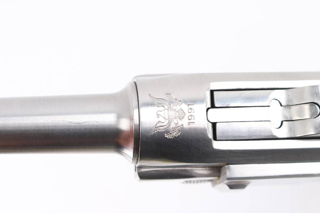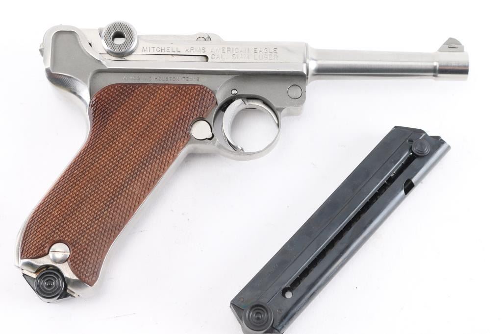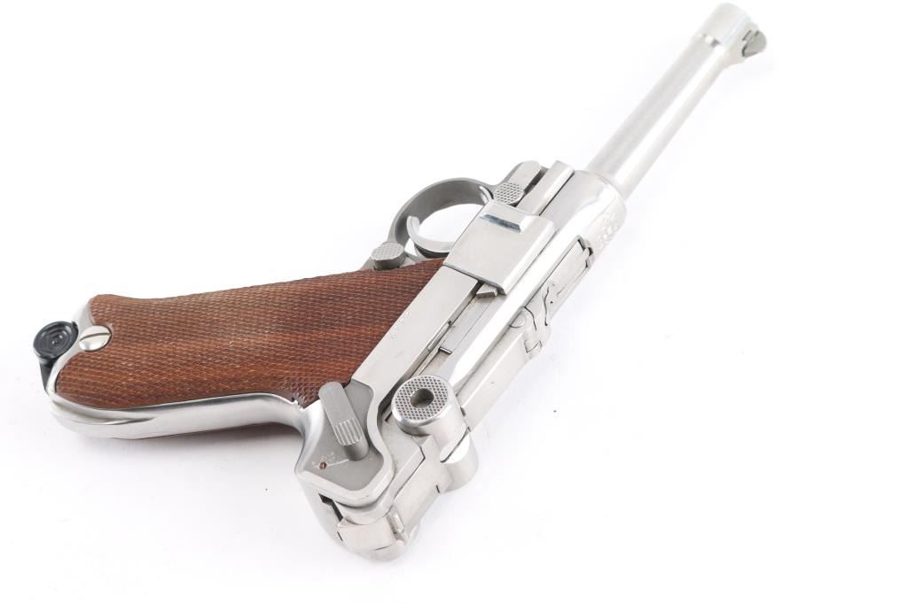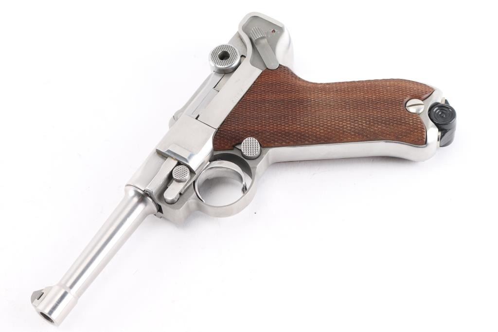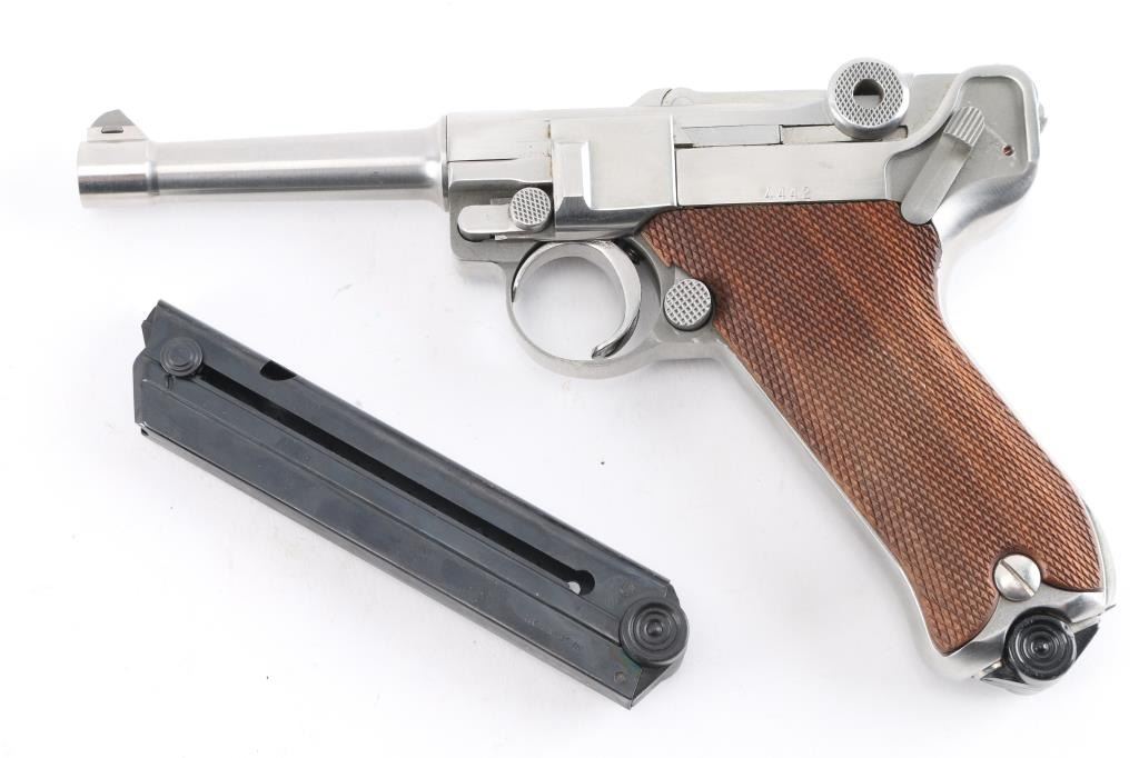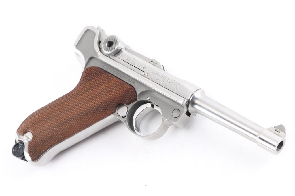 Close copy of Luger P08 Parabellum. Dated 1991. Semiautomatic pistol features stainless steel construction, 4" barrel, checkered wood grips, dovetailed serrated blade front sight and fixed rear sight, left side frame lever safety, left side push button magazine release, smooth curved trigger. Retains approximately 98% finish with faint scratches/scuffs and drag mark from safety. American Eagle and manufacture date stamped into top of receiver. Bore is excellent and bright with strong rifling. Includes two 10 rd magazines and tool in black leather P08 holster, in very good condition.