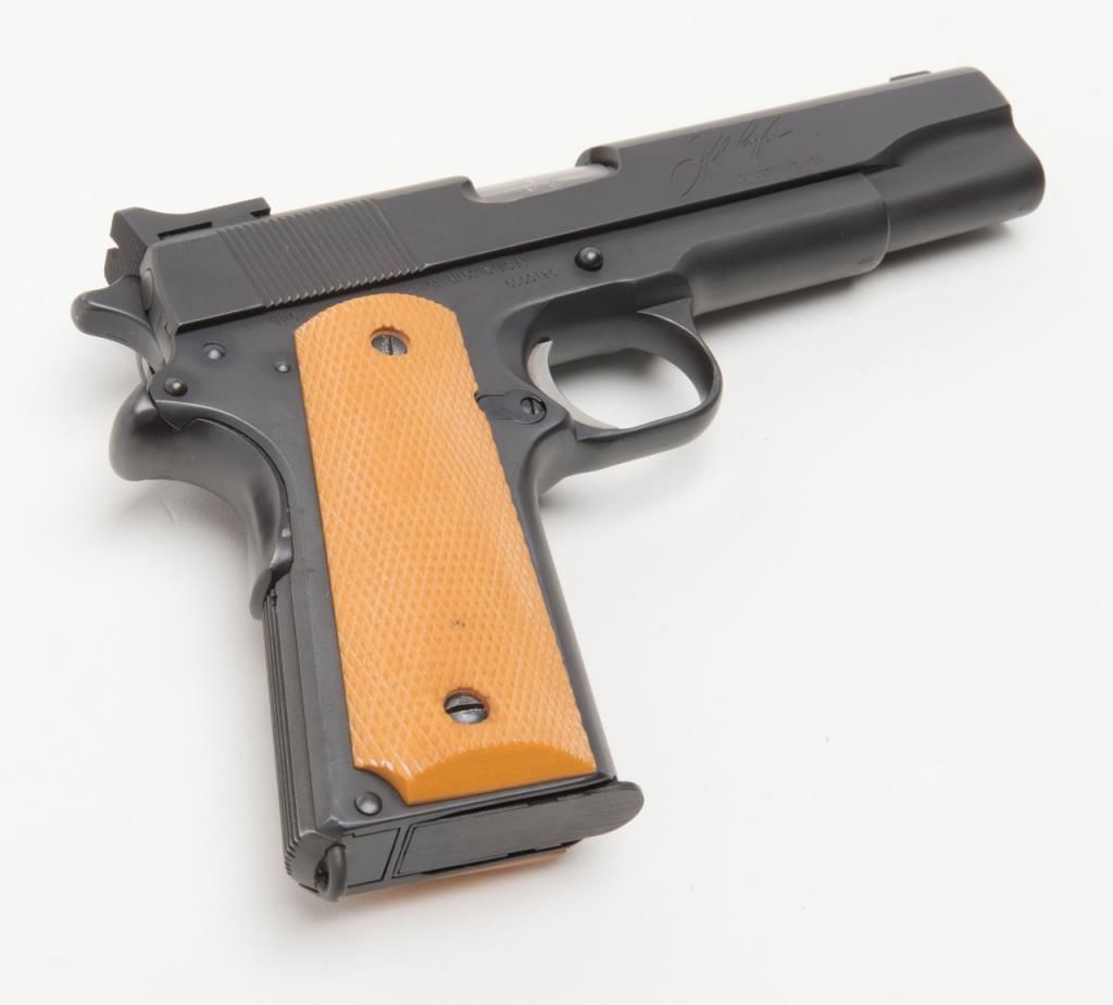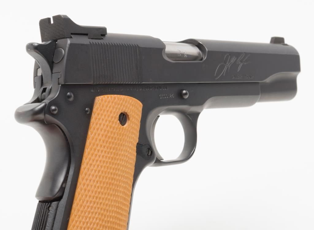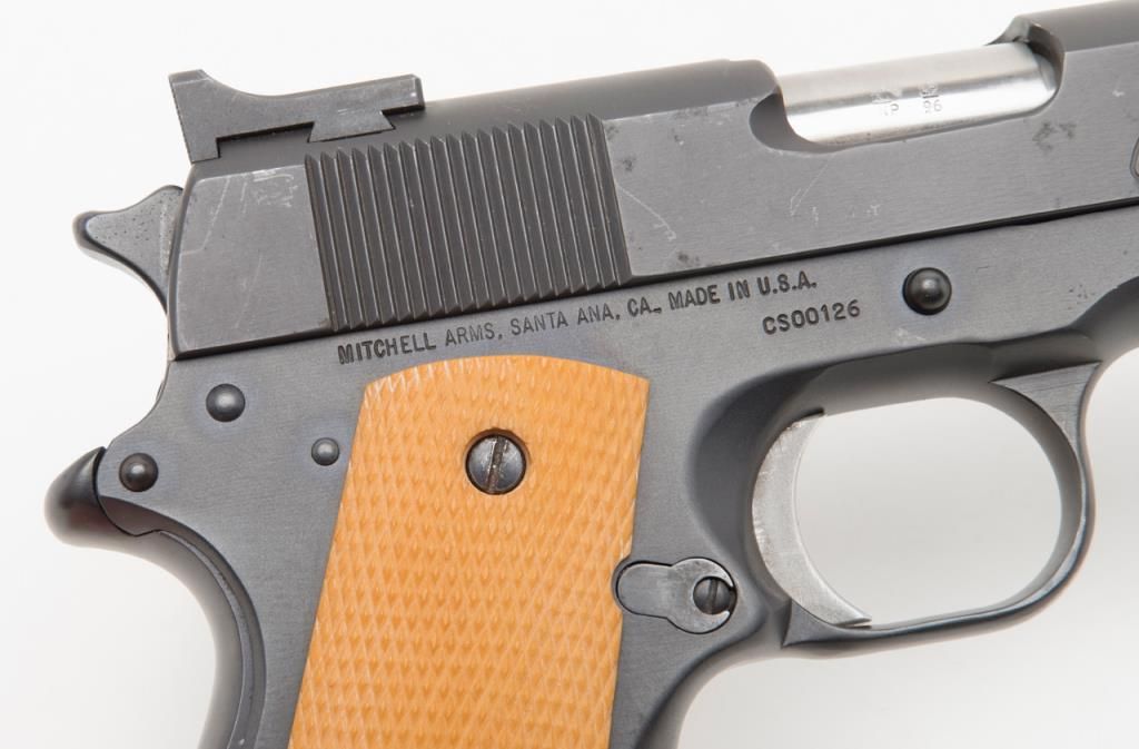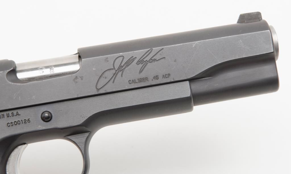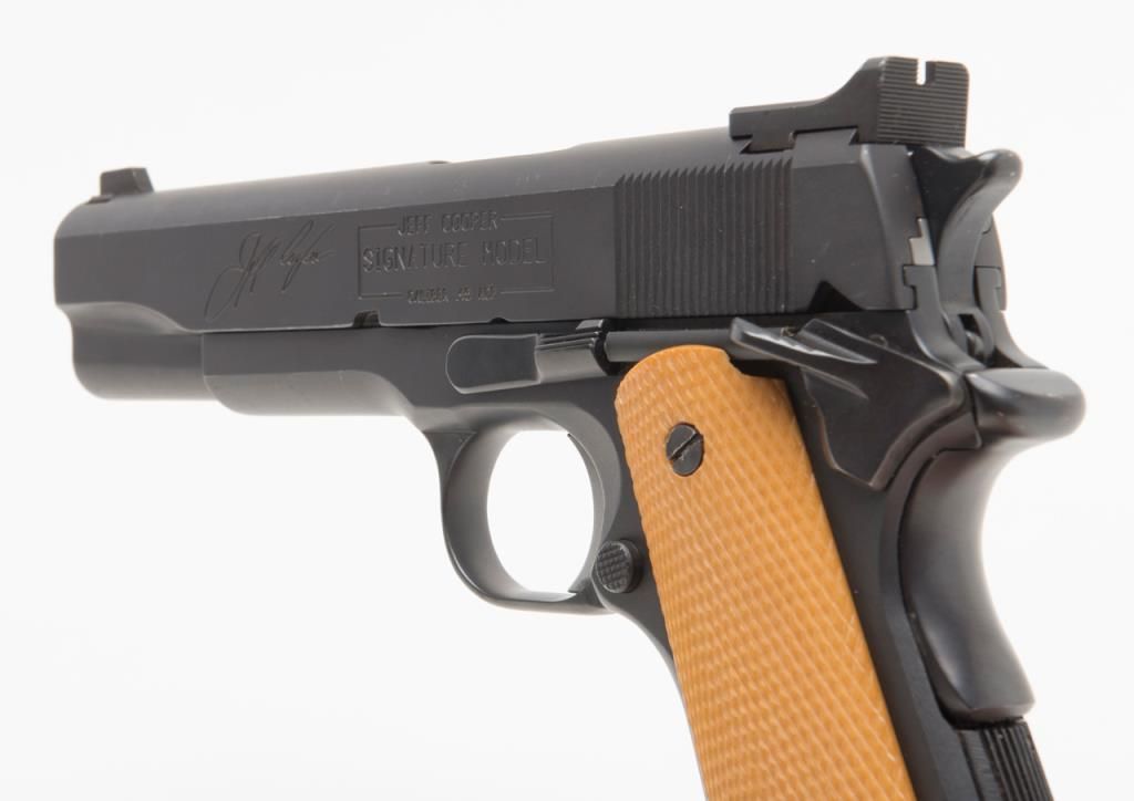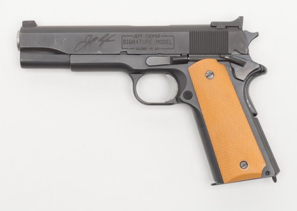 Mitchell Arms Co., Jeff Cooper Signature Model semi-auto pistol, .45 cal., 5” barrel, mat black finish, checkered plastic grips, #CS00126 in overall fine condition showing the majority of its finish, fine bore, crisp action and markings,fine grips. (Modern/PPT). Est.: $500-$1,000.