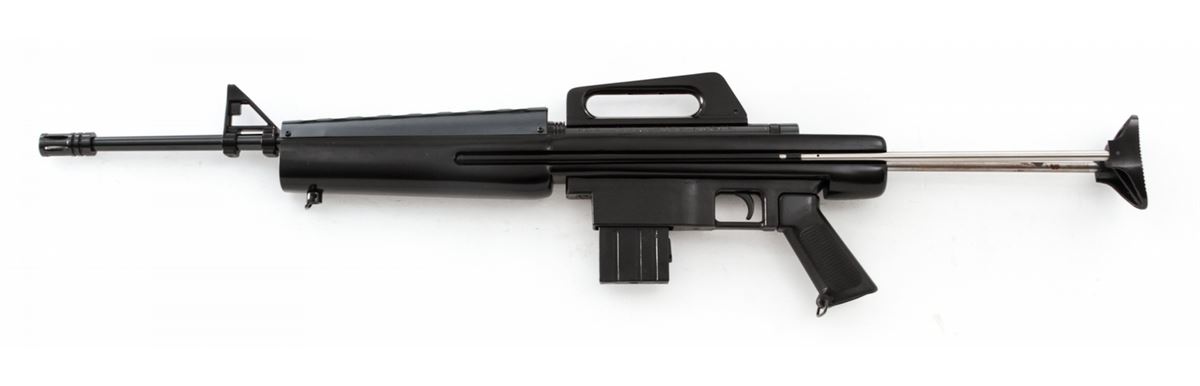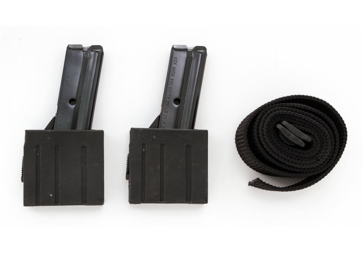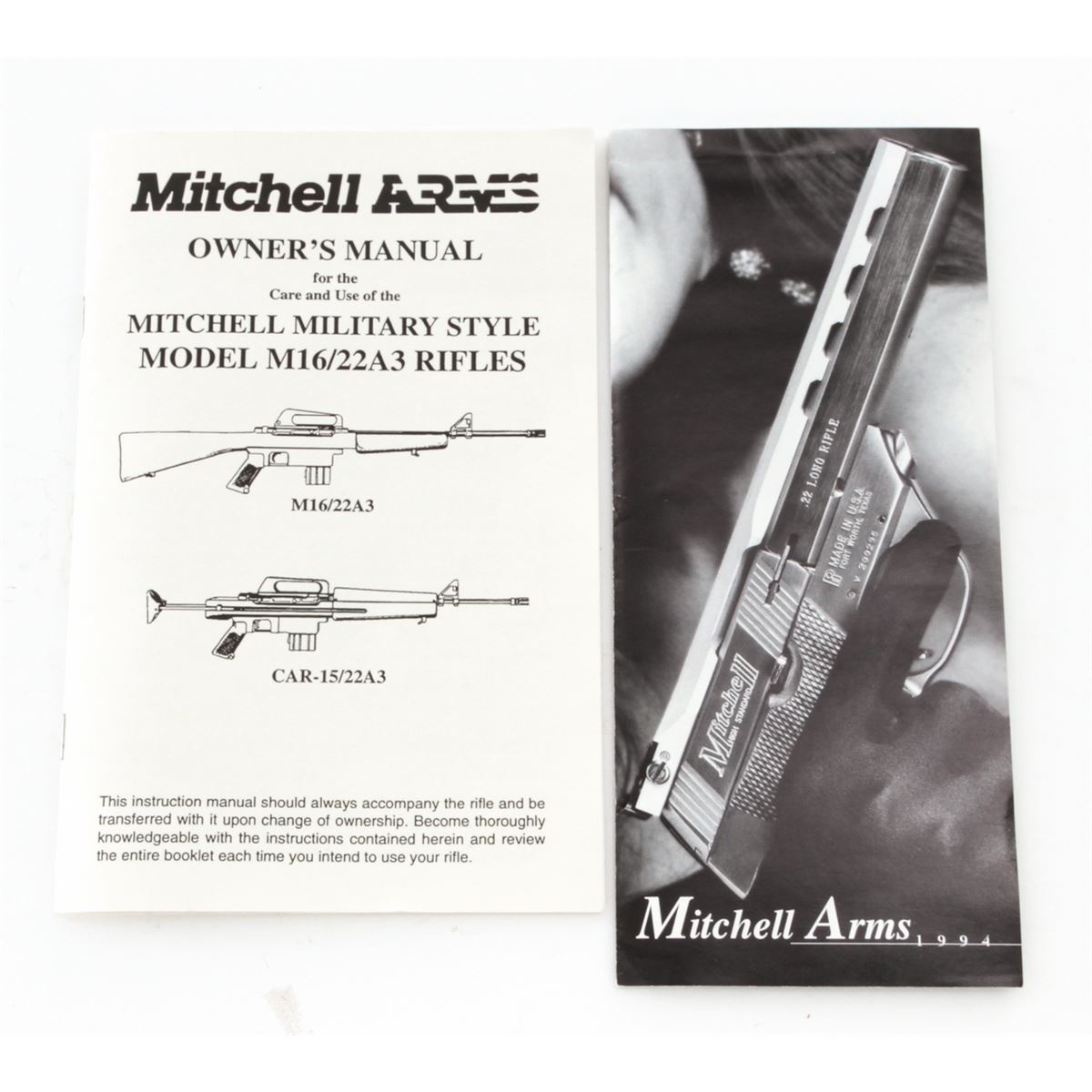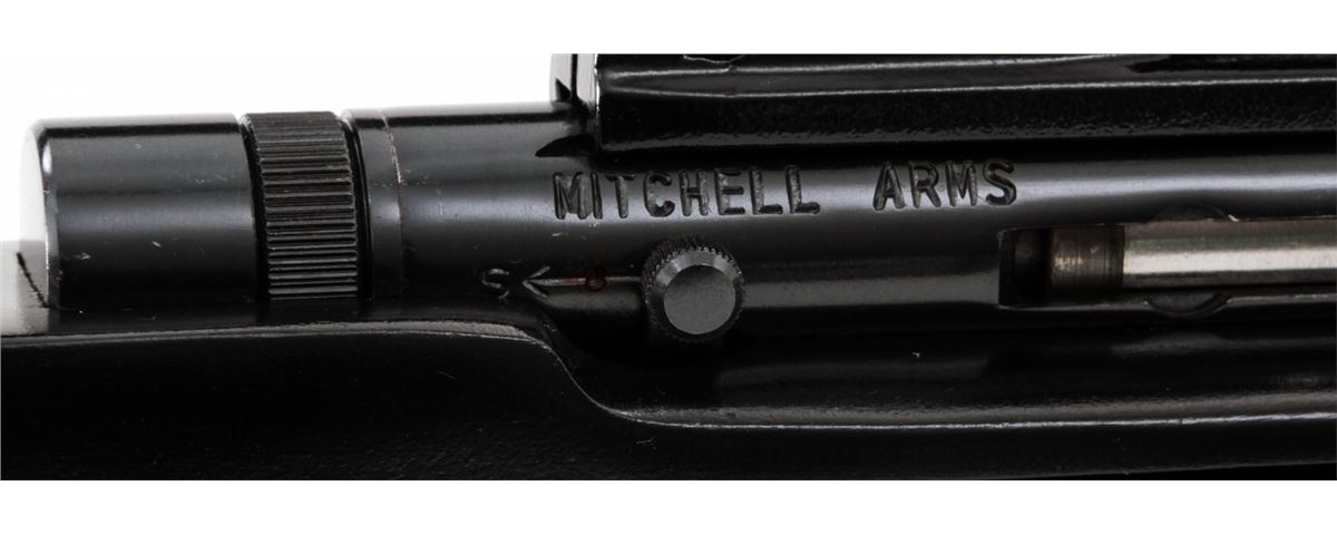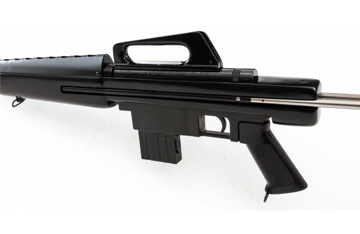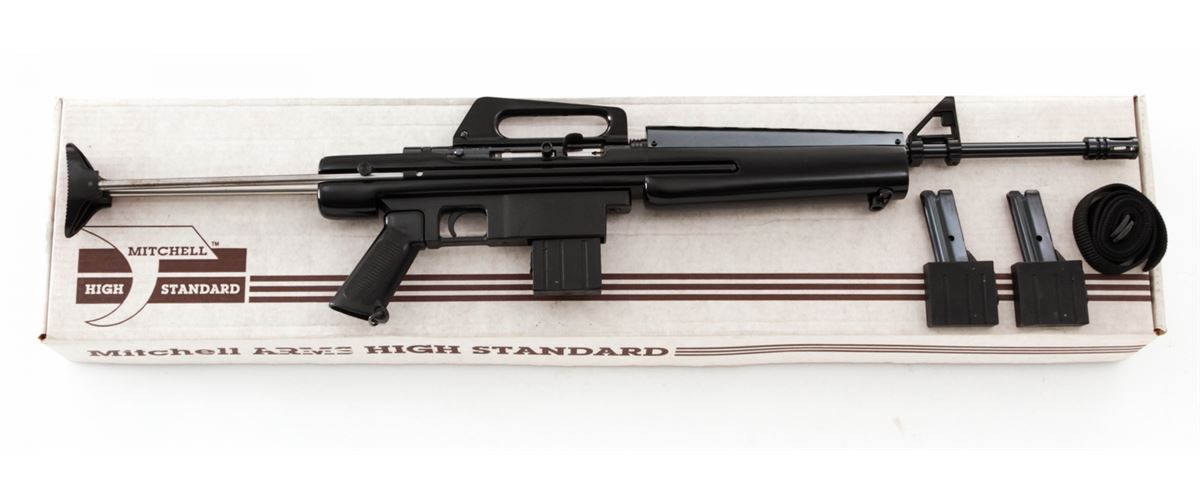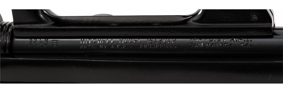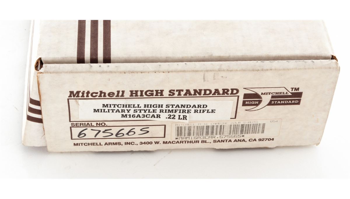 Mitchell Model 16A3CAR Semi-Automatic Rifle, #675665, .22 LR cal., 19'' barrel, black plastic finish, with three magazines and sling. Condition is excellent, appearing as new and unfired, with original preservative still present, which should be cleaned before use. In original box with instructions. Est.: $300-$500. (Modern)