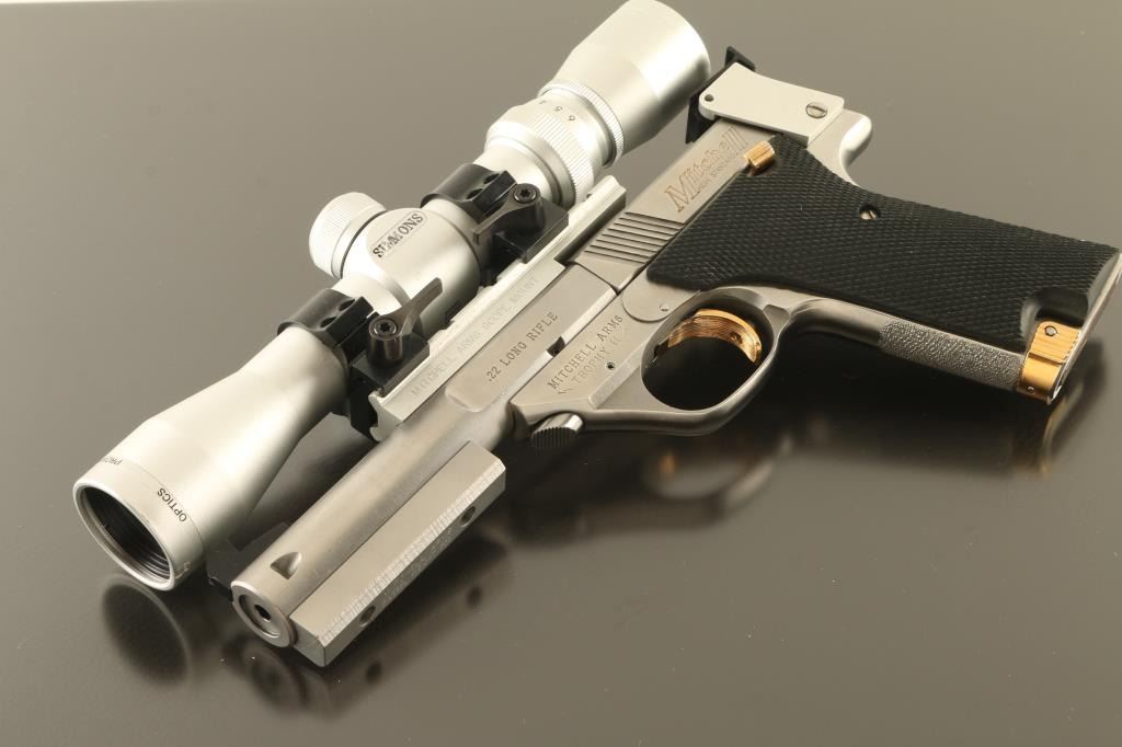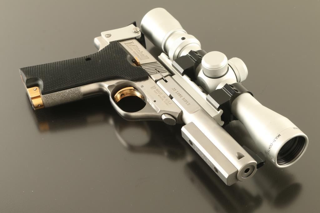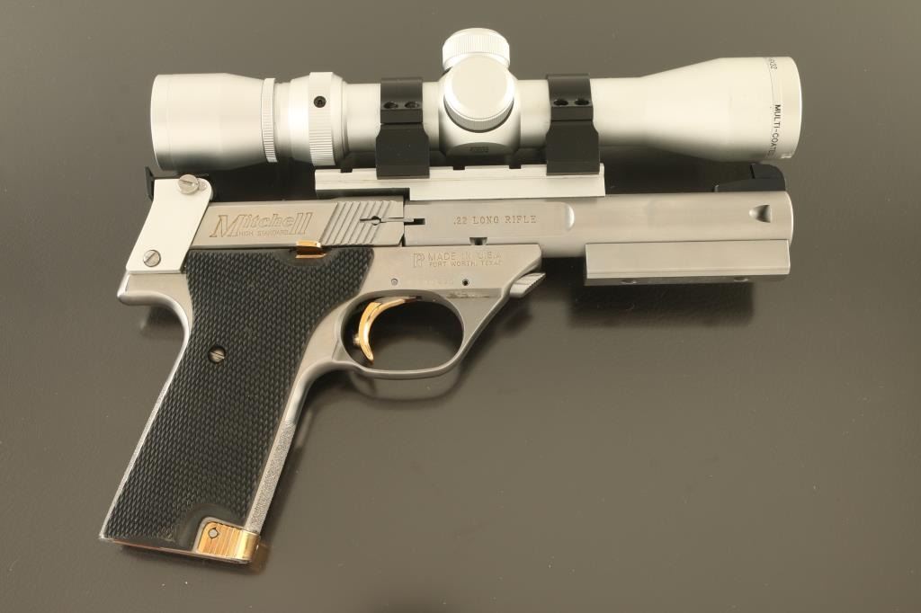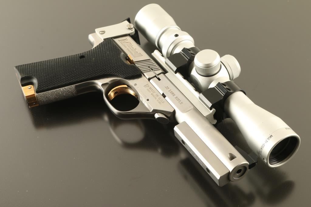 High Standard branded stainless steel rimfire semiautomatic pistol features 5.5" bull barrel with weights, adjustable overtravel stop in trigger, adjustable target sights, gold color accents at trigger and other controls, black rubber checkered grips. Frame is stippled on front and back straps. Weaver type rail is mounted to barrel, with quick detach rings nd silver color Simmons 2-6x pistol scope mounted. Bore is very good condition. External appearance is excellent with slight handling marks, some loss of gold color on controls where handled. Scope is very good condition, duplex reticle, clear view. Includes (1) magazine. Condition is NRA Excellent *** Modern Firearm ***