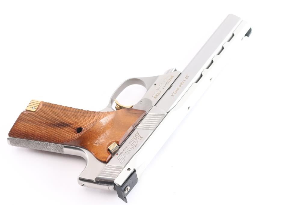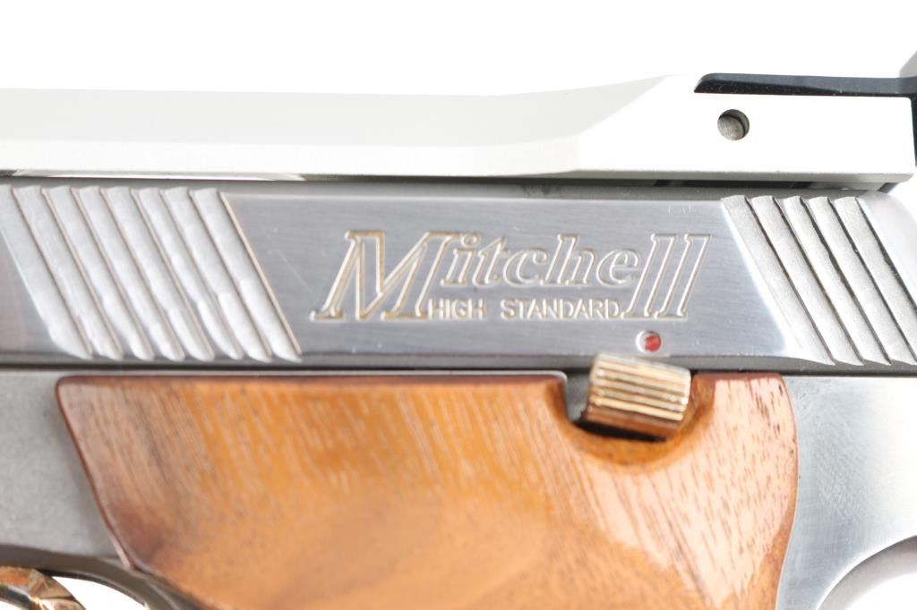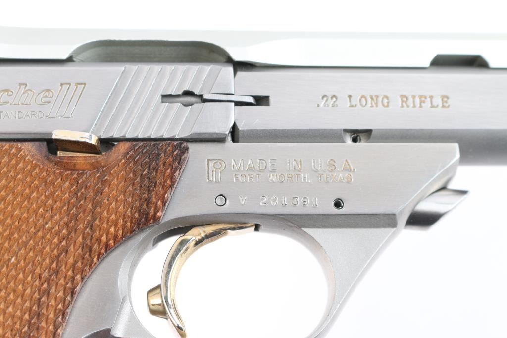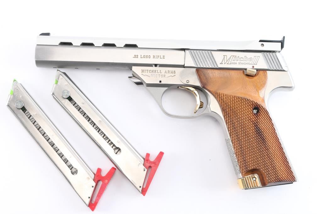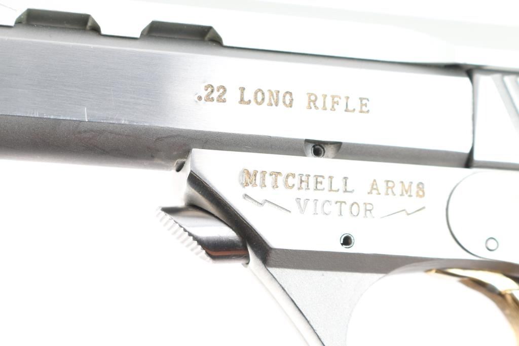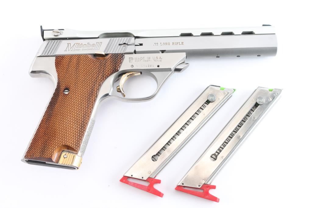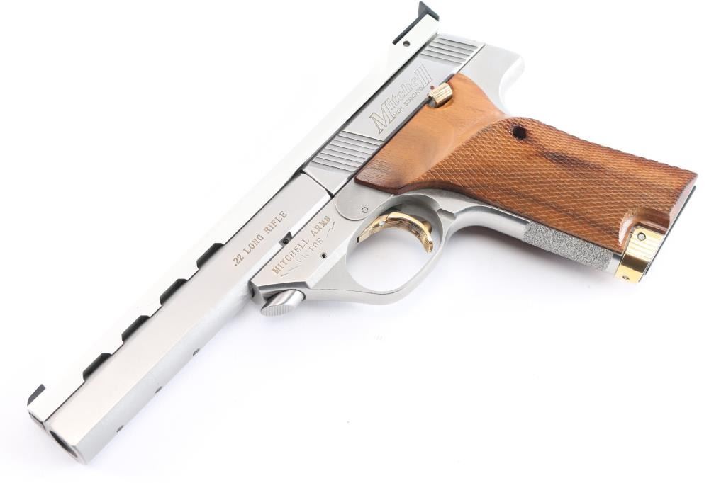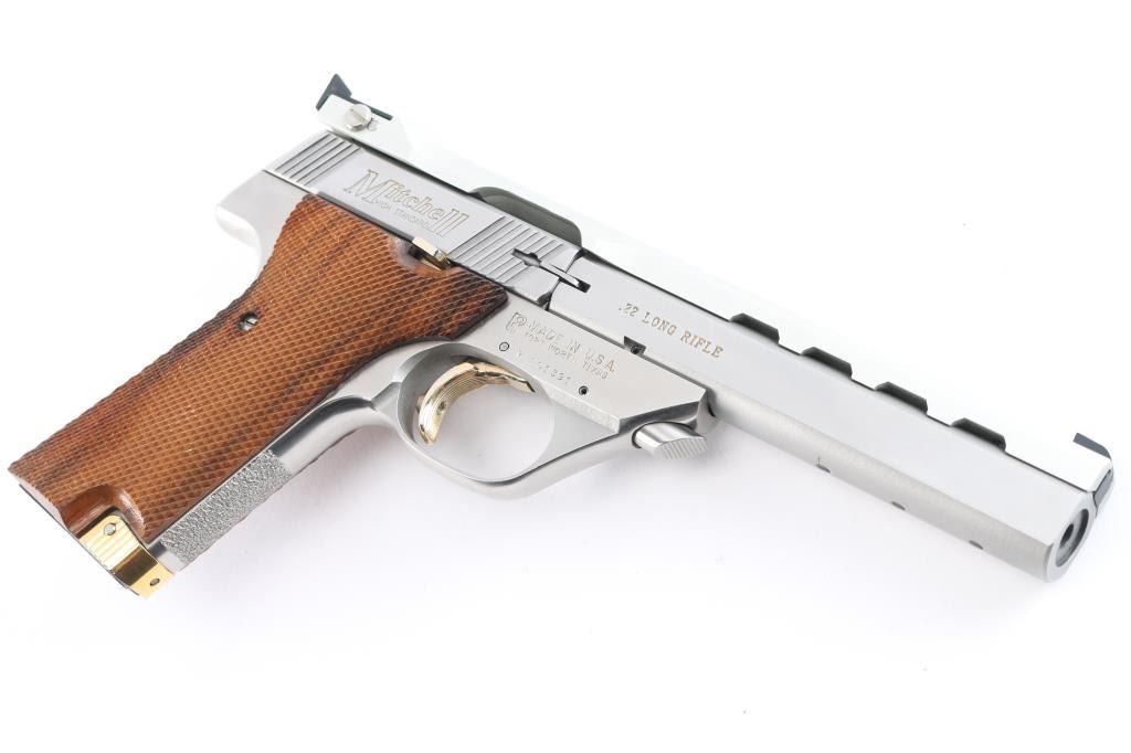 American made vintage style semi-automatic single-action blowback pistol chambered for .22 Long Rifle, manufactured in Fort Worth, TX. These pistols are copies of the Hi-Standard .22 rimfire target pistols, and were made by Mitchell Arms after High Standard went out of business in 1984. Pistol features a stainless steel finish with polished flats and matte contours, a slab-side 5-1/2" ventilated ribbed barrel with recessed crown, barrel drilled and tapped for barrel weights, serrated take-down push-button, gold-toned frame mounted manual safety, fixed partridge front sight, adjustable notch rear sights, gold-toned serrated curved trigger adjustable for weight and travel, gold-toned serrated slide stop, sear adjustment screw on rear of frame, gold-toned toe mounted magazine release, stippled grip straps, and two-piece fully checkered walnut grips with right hand thumb rest. The original stainless finish retained is approximately 96% with edge wear on the left side of the barrel, and a few minor scattered scratches. Metal displays no rust, but there is deformation at the rear of the barrel from the slide going back into battery. The action is smooth and crisp, and the grips are excellent. Bore appears bright with strong rifling. The ventilation rib is a little loose, and can be tightened. Pistol includes three magazines total.
