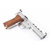 Pistol. Semi-Automatic. 10-rd magazine. 5.5" ventilated ribbed barrel with rib mounted front blade, and adjustable notch rear sights. Weight, and travel adjustable trigger stop. Full checkered walnut grips with right thumb rest. Push button barrel take-down. Barrel weight attached. Stainless steel finish with matte barrel rib. Gold colored serrated trigger, mag release, and thumb safety. Left frame mounted slide release. Slide action is smooth/tight. Bore appears excellent/bright, a little dirty. Grips are excellent. Stainless finish is very good with some minor scratches. NRA Condition-Very Good plus. Modern firearm