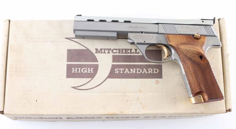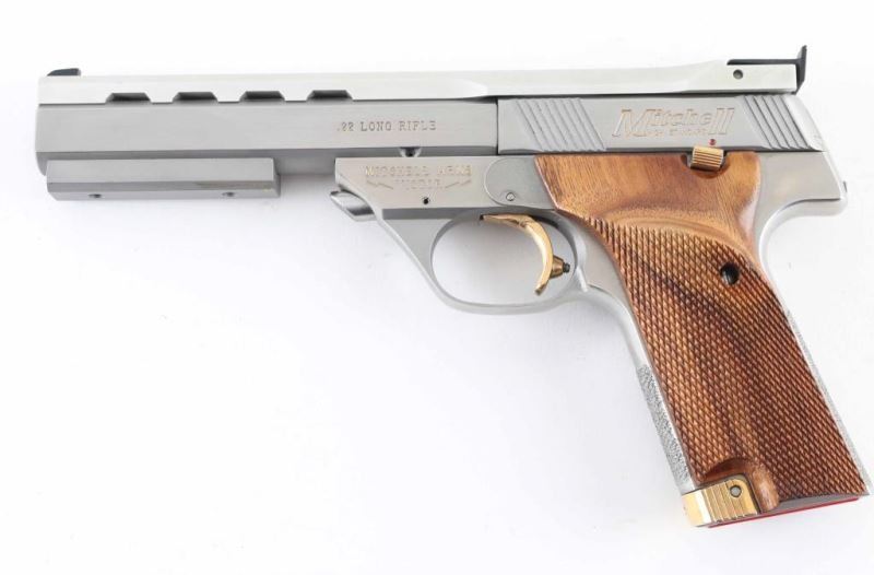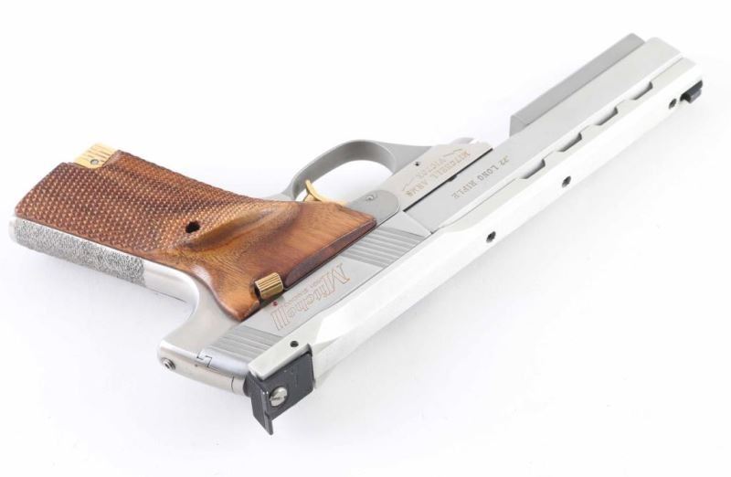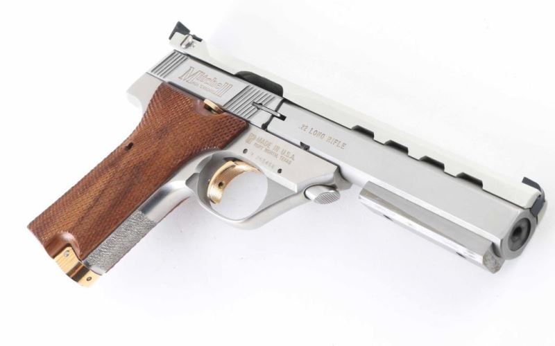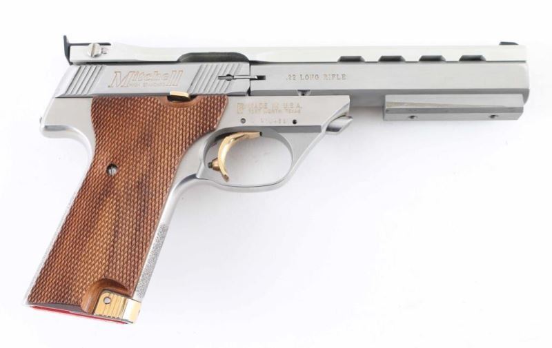 Pistol. Semi-Automatic. 10-rd magazine. 5.5" ventilated ribbed barrel with rib mounted front blade, and adjustable notch rear sights. Weight, and travel adjustable trigger stop. Full checkered walnut grips with right thumb rest. Push button barrel take-down. Barrel weight attached. Stainless steel finish with matte barrel rib. Gold colored serrated trigger, mag release, and thumb safety. Left frame mounted slide release. Slide action is smooth/tight. Bore appears excellent/bright, a little dirty. Grips are excellent. Stainless finish is very good with some minor scratches. comes in the original factory box with manual. NRA Condition-Very Good. Modern firearm