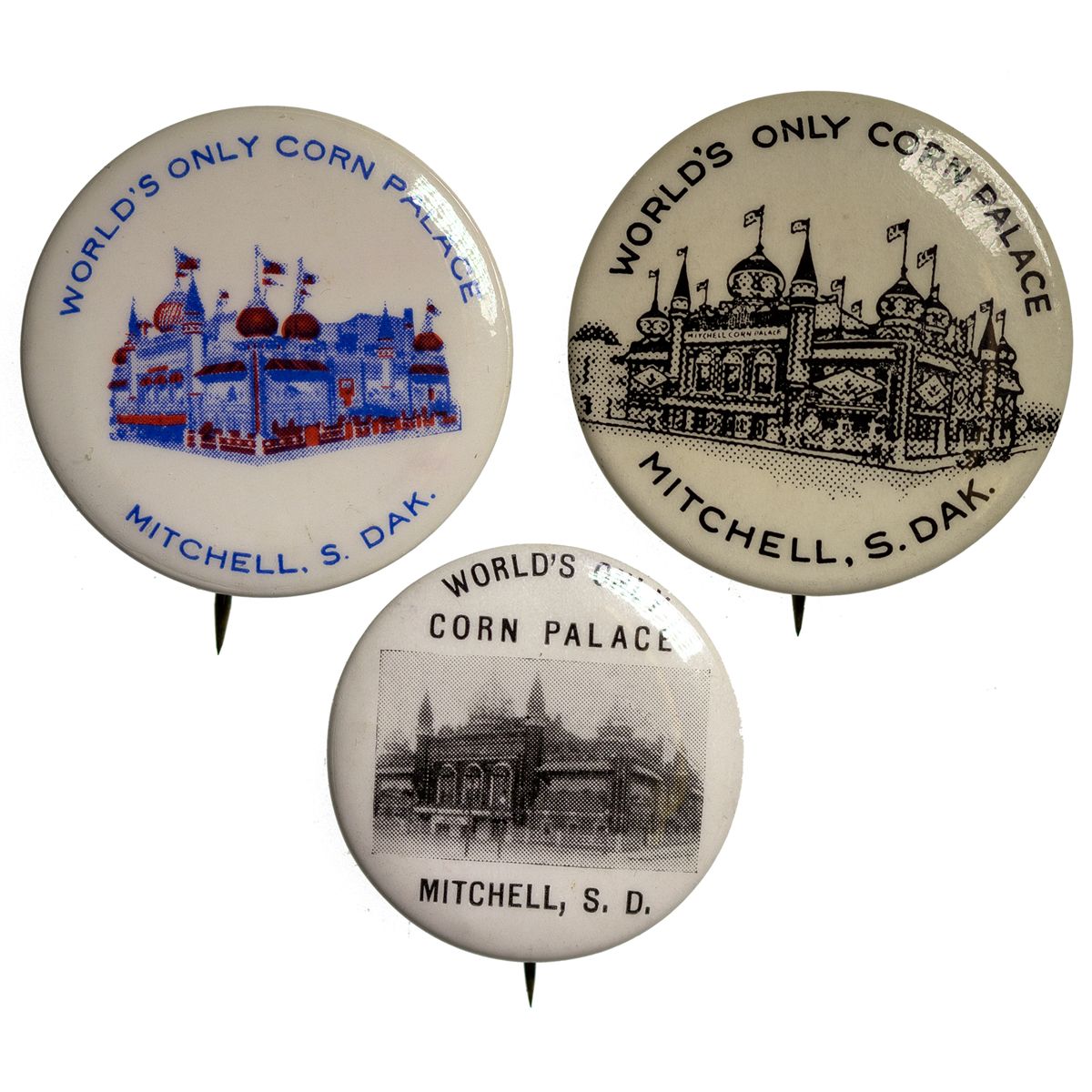 Mitchell, South Dakota. Lot of three: World's Only Corn Palace souvenirs. The original Corn Palace was built in 1892 and completed in 1921. The Domes and minarets were added in 1937. - Weber Collection