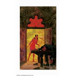Mitchell Hooks - Original Paperback Cover Art (1971). Mitchell Hooks is a respected and talented illustrator whose work has appeared in numerous areas of the commercial art field. Though he has been published in a number of the national magazines, he is probably best known for his many memorable paperback covers painted for such publishers as Bantam, Avon, Dell, Signet, and Gold Medal. This painting was published as Bantam #N5792 - The Unfinished Clue, by Georgette Hyer. It is rendered in gouache on board and measures approximately 24 x 14. Mitchell Hooks is credited, along with the book title, on the back of the board. There is water damage affecting the bottom 3 inches of the board, which does not detract from the primary image, and could easily be matted out. Important notice: We expect to be auctioning lots at the rate of 200-250 per hour. Sometimes eBay Premier live bid software cannot keep up with that pace, so we strongly recommend that you place a realistic proxy bid now as insurance to avoid disappointment. Also please note that all Heritage/CAA lots purchased through eBay Premier carry a 20% Buyer's Premium. Please make sure you read the Terms and Conditions.