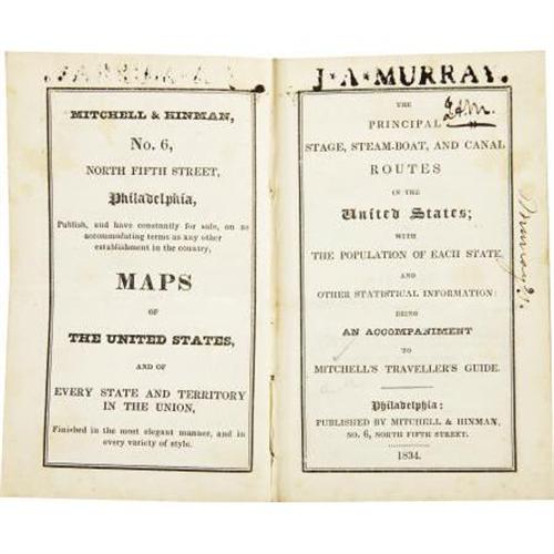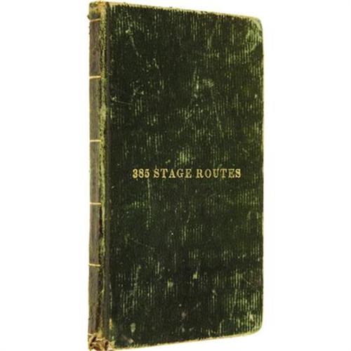 <B>[Samuel Augustus Mitchell]. </B></I><B><I>The Principal Stage, Steam-boat, and Canal Routes in the United States</B></I></B></I><B>;</B></I> with the Population of each State, and other statistical information: being an accompaniment to Mitchell's Traveller's Guide. Philadelphia: Published by Mitchell & Hinman, 1834. <BR><BR>Small octavo. 96 pages. <BR><BR>Attractive contemporary binding of ribbed green leather, lettered in gilt on the front cover "385 Stage Routes" and ruled in gilt on the spine. Binding rubbed and worn at the corners, endpapers and preliminary and terminal leaves with pencil writing and doodles and with ink signatures and stamps. Ink stamps and signatures to a couple other places in the text, including the title page. Unusual little handbook of routes with their mileage from this noted Philadelphia map publisher.<BR><BR><b>Shipping:</b> Books & Catalogs (<a target="_blank" href="http://www.heritageauctions.com/common/shipping.php">view shipping information</a>)