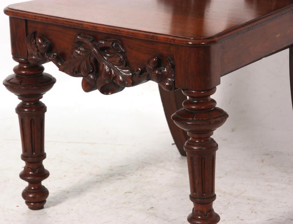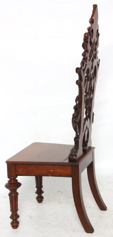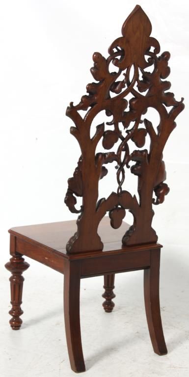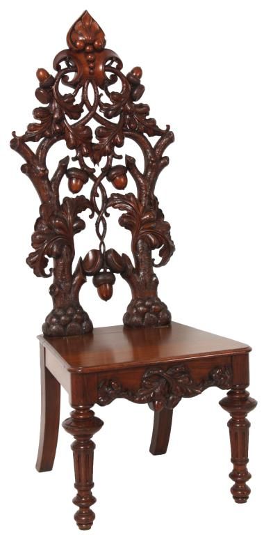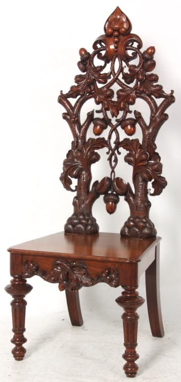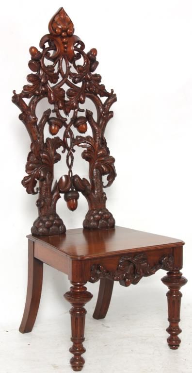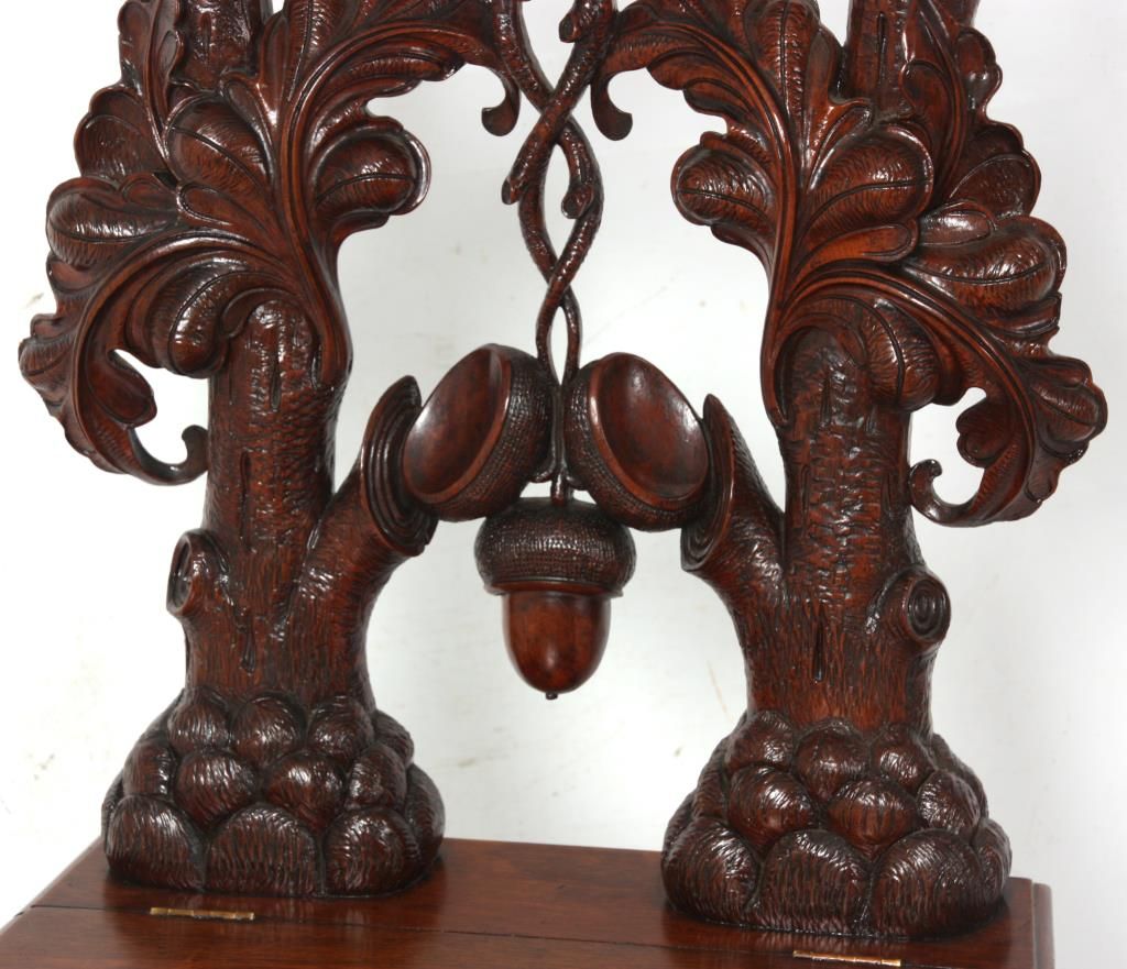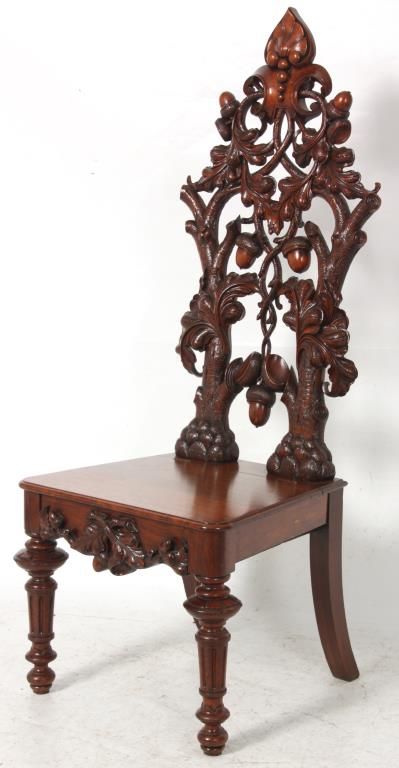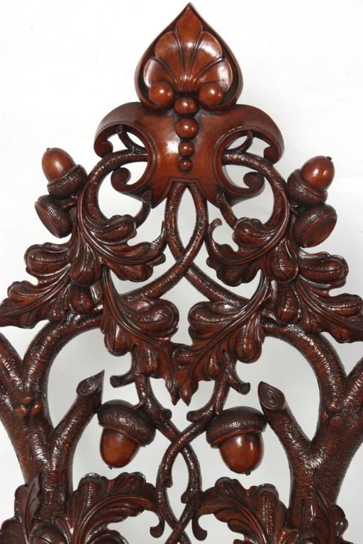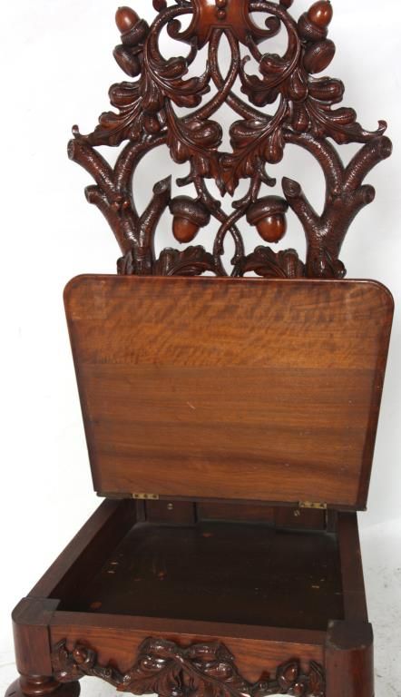 Attr: Mitchell & Rammelsberg Pierced Carved Walnut Lift Seat Slipper Chair. Tall pierced carved back has a large shell over a medallion at the crest, heavily carved oak branch supports with large acorns and oak leaves, seat has a lift top with well compartment, leaves and acorns carved in the front; stands on turned and fluted front legs. In excellent condition, nice original finish. 52 in. high x 21 in. wide x 18 in. deep.