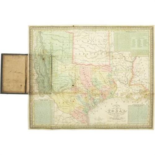 <B>Samuel Augustus Mitchell: </B></I><B><I>New Map of Texas</B></I></B></I><B>, 1842</B></I> (Philadelphia: S. A. Mitchell, 1842), 15" x 12.5". The full title of the map is <I>New Map of Texas, with the Contiguous American and Mexican States</B></I>. Entered by Samuel Augustus Mitchell. Hand-colored engraving by J. H. Young. Three text insets include "<I>Remarks on Texas</B></I>," "<I>Land Grants</B></I>," and "<I>Rivers of Texas</B></I>." The map was originally folded into a small (3" x 5"), leather-bound pocket folder with a gilt stamp, which is also included. The map is in very good condition with original folds and some minor stains; the pocket folder is very good. <I>Ex. Dallas Historical Society.</B></I><BR><BR><b>Shipping:</b> Flat Material, Large (<a target="_blank" href="http://www.heritageauctions.com/common/shipping.php">view shipping information</a>)
