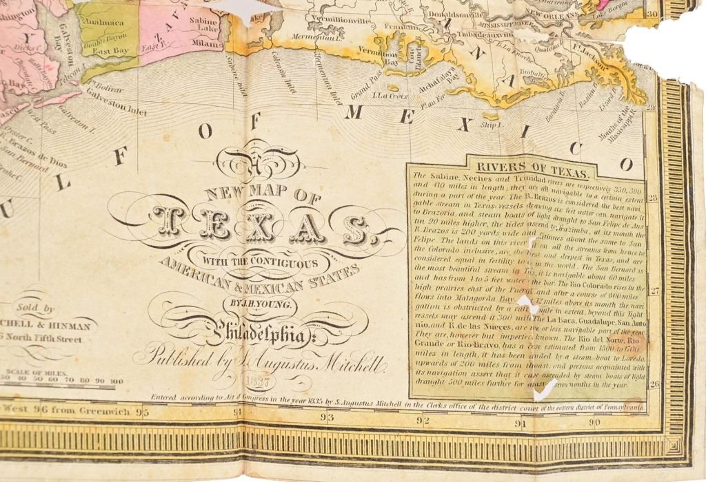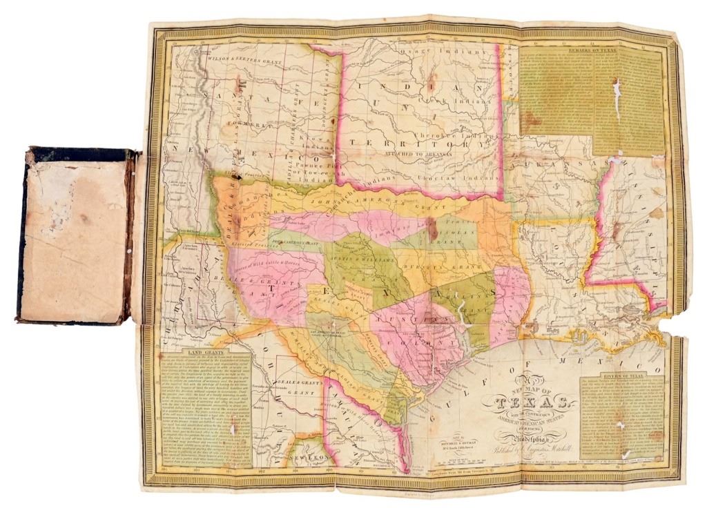 With original pocket cover. Original 1837 map. This map was published by Augustus Mitchell in Philadelphia in 1837. Copyrighted 1835 in Washington D.C., they were published from 1835-1837. This is the 1837 map, and it shows all land grants made by the Mexican Government and shows the names of all grantees. The map shows the national boundary line as the Nueces River, and the territory between the Nueces and the Rio Grande is named Mustang of Wild Horse Desert. All roads between East Texas and the Rio Grande are also shown. Measures 12" x 15" James Hamilton Young, A New Map Of Texas With The Contiguous American & Mexican States. Philadelphia: S. Augustus Mitchell 1837. (copyright 1835)