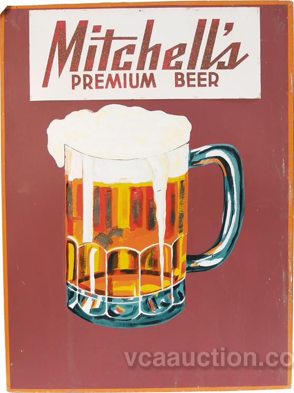 "Mitchell's Premium Beer" Hand-Painted Cardboard Sign w/ picture of mug of beer - 36" x 48"