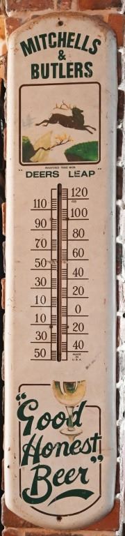 Large working metal thermometer. Mitchell's brand was an original Texas brewery in El Paso, Texas. Measures 8.25" x 38.5"