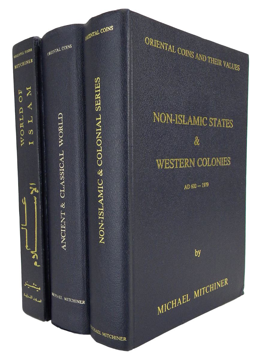 Mitchiner, Michael. ORIENTAL COINS AND THEIR VALUES: I. THE WORLD OF ISLAM. First edition. London, 1977. [with] Mitchiner, Michael. ORIENTAL COINS AND THEIR VALUES: II. THE ANCIENT & CLASSICAL WORLD, 600 B.C.-A.D. 650. First edition. London, 1978. [with] Mitchiner, Michael. ORIENTAL COINS AND THEIR VALUES: III. NON-ISLAMIC STATES & WESTERN COLONIES, AD 600-1979. First edition. London, 1979. Three volumes, complete. 4to, original matching blue leatherette, gilt. Previous owner's bookplates. Near fine. See catalogue for full description.