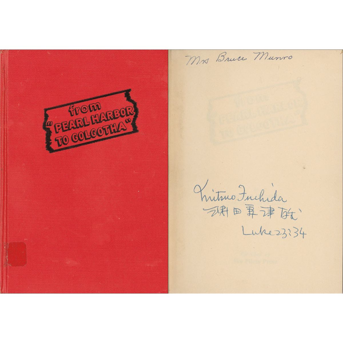 Mitsuo Fuchida signed memoir, ''From 'Pearl Harbor to Golgotha''' published by Ski Pilots Press: San Jose: 1955. Signed in blue ballpoint on the front free endpaper, ''Mitsuo Fuchida'' adding the Biblical verse ''Luke 23:34'' and his name in Japanese characters. After WWII, Fuchida emigrated to the U.S. and became a Christian preacher. Hardcover 5.5'' x 7.5'' book runs 94 pages. In good condition, with some soiling and chipping to the boards, a former owner's name written at the top of the signature page, and two library card paste-downs.