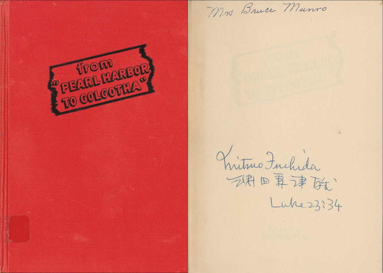 Mitsuo Fuchida signed memoir, ''From 'Pearl Harbor to Golgotha''' published by Ski Pilots Press: San Jose: 1955. Signed in blue ballpoint on the front free endpaper, “Mitsuo Fuchida” adding the Biblical verse “Luke 23:34” and his name in Japanese characters. After WWII, Fuchida emigrated to the U.S. and became a Christian preacher. Hardcover 5.5'' x 7.5'' book runs 94 pages. In good condition, with some soiling and chipping to the boards, a former owner’s name written at the top of the signature page, and two library card paste-downs.
