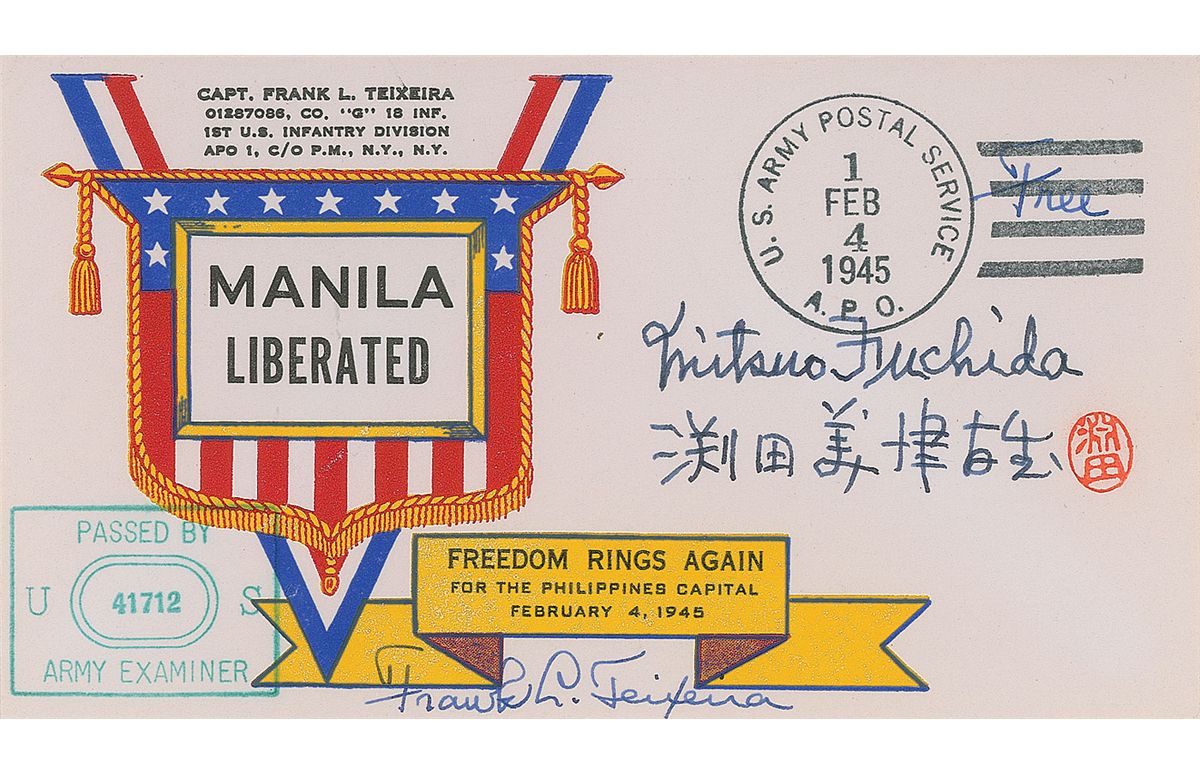 One of Japan’s most skilled fliers, Fuchida (1902–1976) commanded the air attack against Pearl Harbor on December 7, 1941, and was the last to leave the battle area. After World War II, Fuchida converted to Christianity and became a nondenominational preacher, traveling frequently to America and later becoming a US citizen. Teixeira was a captain in the 1st US Infantry Division who designed and published 34 patriotic covers during the war. Commemorative cover with a cachet honoring the liberation of Manila, signed in ink, “Mitsuo Fuchida” and “Frank L. Teixeira,” with Fuchida also signing in Japanese. In fine condition.