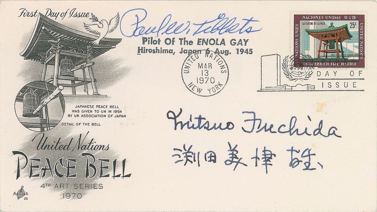 Artcraft 4th Art Series FDC with a cachet honoring the United Nations Peace Bell, postmarked March 13, 1970, signed in blue ballpoint, ”Paul W. Tibbets,” and in black felt tip, “Mitsuo Fuchida,” adding his Japanese characters below. In fine condition.