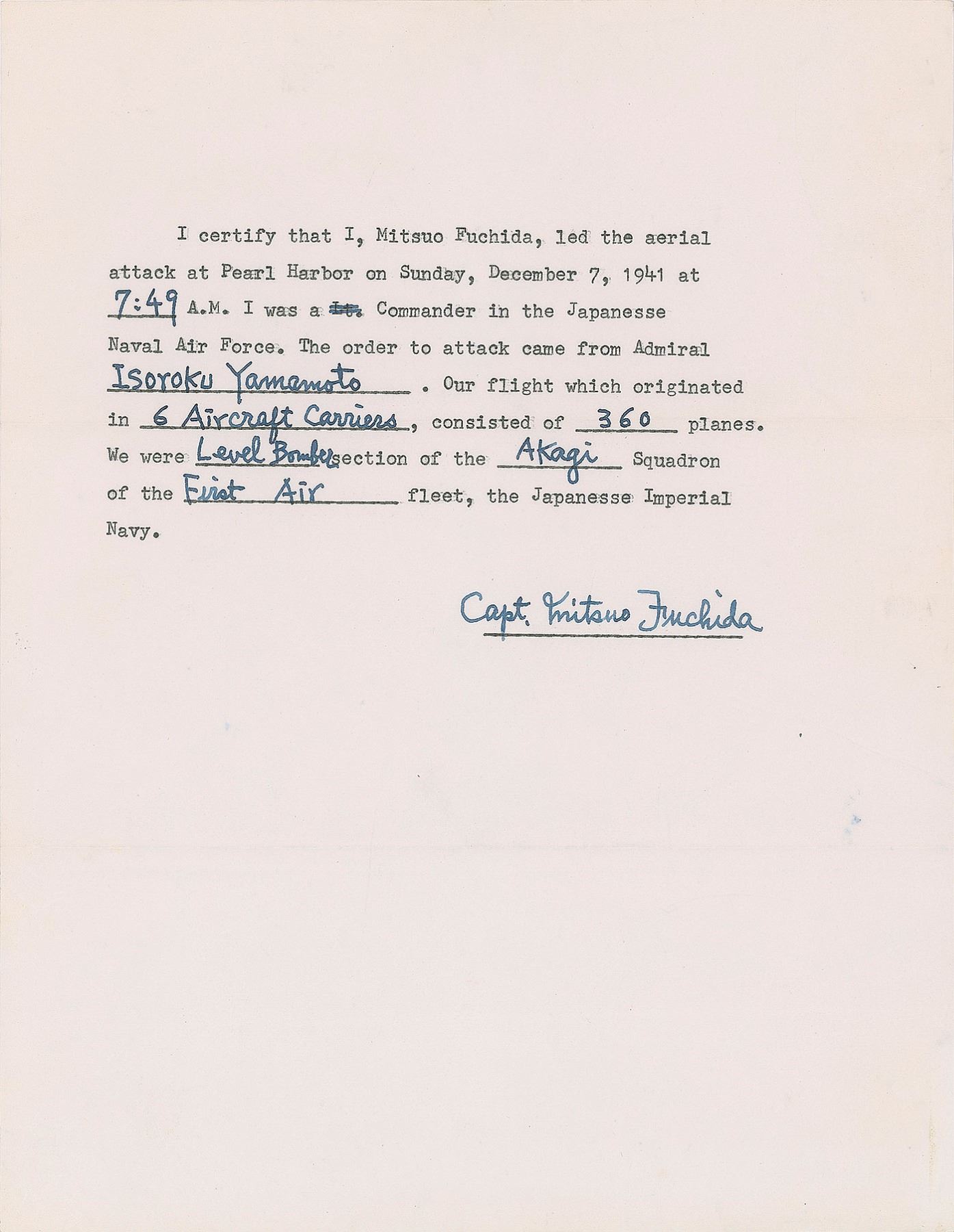 Partly-printed souvenir typescript filled out in Fuchida's hand and signed at the conclusion, "Capt. Mitsuo Fuchida," one page, 8.5 x 11, in full: "I certify that I, Mitsuo Fuchida, led the aerial attack at Pearl Harbor on Sunday, December 7, 1941 at 7:49 A.M. I was a Commander in the Japanesse Naval Air Force. The order to attack came from Admiral Isoroku Yamamoto. Our flight which originated in 6 Aircraft Carriers, consisted of 360 planes. We were Level Bomber section of the Akagi Squadron of the First Air fleet, the Japanesse Imperial Navy." In fine condition, with scattered light creasing.
