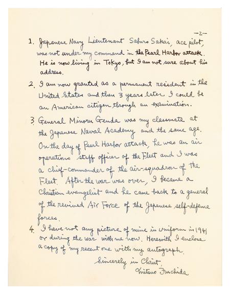 Autograph letter signed by Mitsuo Fuchido, the Japanese naval air officer who commanded and personally led the first wave of the attack on Pearl Harbor. Fine content two-page letter datelined Seattle, 27 December 1966, in English to Cornelius Greenway: ''I am in Seattle, Wash. This is my headquarters in the United States for the Capt. Fuchida Evangelistic Association. On my Honolulu visit, it was the 25th anniversary of the Pearl Harbor attack and my testimony had been richly blessed…Now I want to answer for your question…1. Japanese Navy Lieutenant Safuro Sakai, ace pilot, was not under my command in the Pearl Harbor attack. 2. I am now granted as a permanent resident in the United States. 3. General Minoru Genda was my classmate at the Japanese Naval Academy.On the day of Pearl Harbor attack, he was an air operations staff officer of the Fleet and I was a chief-commander of the air-squadron of the Fleet. After the war was over, I became a Christian evangelist.'' Near fine condition with original signed envelope.