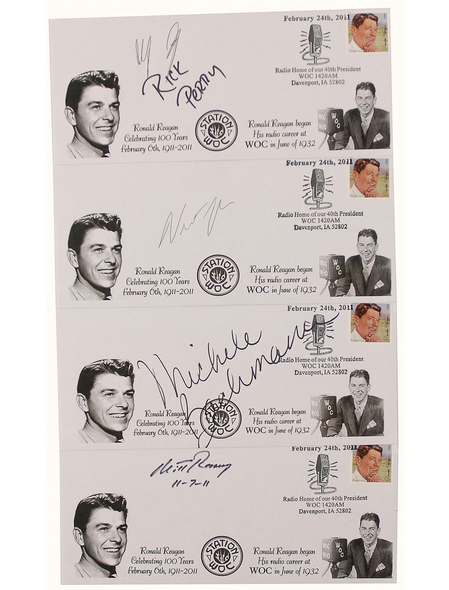 Four identical commemorative covers, 9.25 x 4, honoring Ronald Reagan and his radio career at WOC in Davenport, Iowa, each signed by a different 2012 presidential candidate while making stops in Davenport. Signers are: Mitt Romney, Rick Perry (also signed by Louisiana governor Bobby Jindal), Newt Gingrich, and Michele Bachmann. In fine condition.