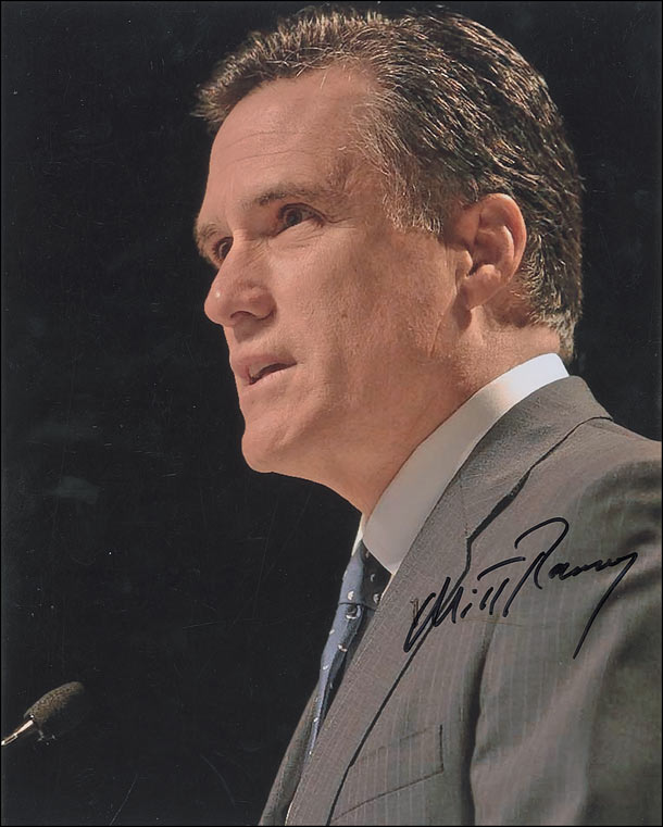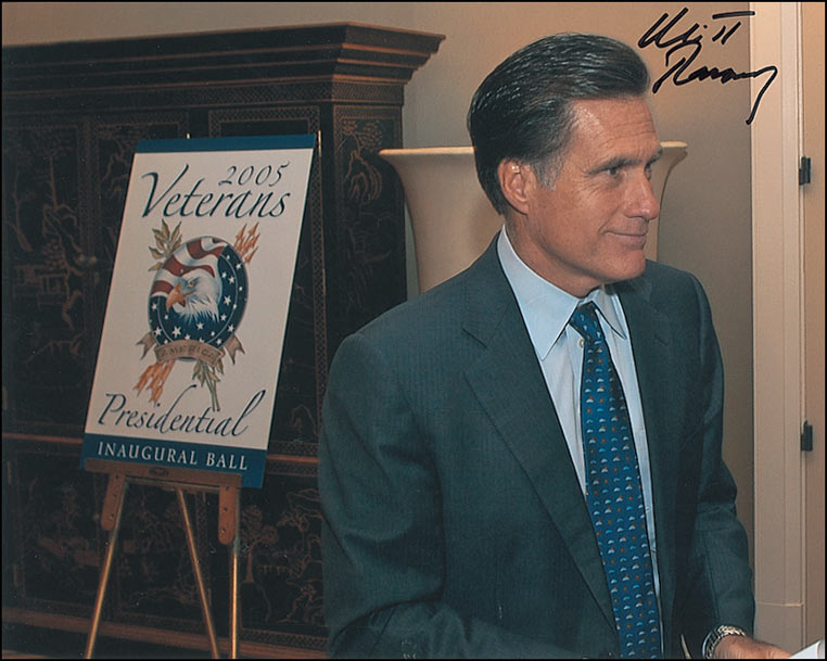 Two color glossy photos of Romney, one 10 x 8 and one 8 x 10 photo, each signed in black felt tip “Mltt Romney.” In overall fine condition with a few surface impressions and a stain under his signature on one of the photos.