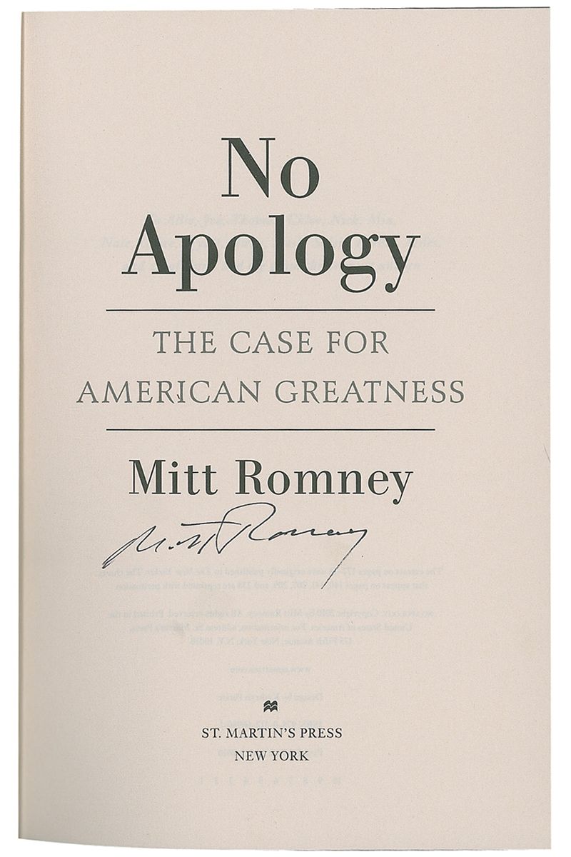 Signed book: No Apology. First edition, first printing. NY: St. Martin's Press, 2010. Hardcover with dustjacket, 6.25 x 9.5, 323 pages. Signed on the title page in black ink. In fine condition. Consignor notes signature was acquired at Barnes and Noble in Orlando, Florida on March 26, 2010.