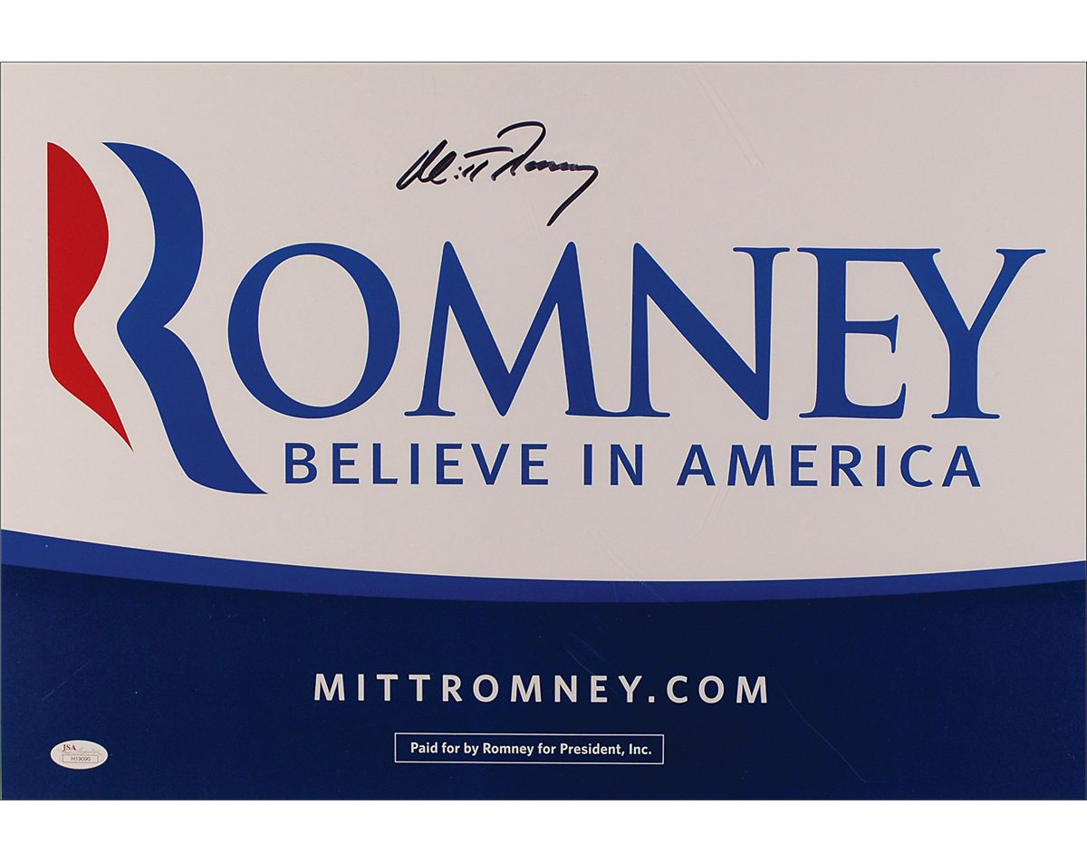 Romney ‘Believe in America’ campaign sign, 19 x 13, signed at the top in black felt tip. Rolled and in fine condition, with a JSA authentication label affixed to lower left corner. Accompanied by a certificate of authenticity from JSA.