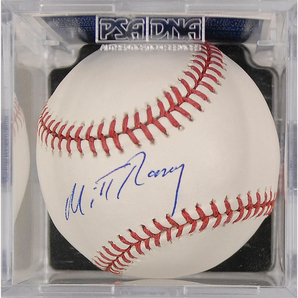 Official Rawlings Major League baseball signed in blue ballpoint on the sweet spot. Encapsulated in a plastic PSA/DNA authentication holder. In very fine condition. Accompanied by a certificate of authenticity from PSA/DNA grading the ball and autograph a “9,” and giving the ball an overall grade of a “9.”