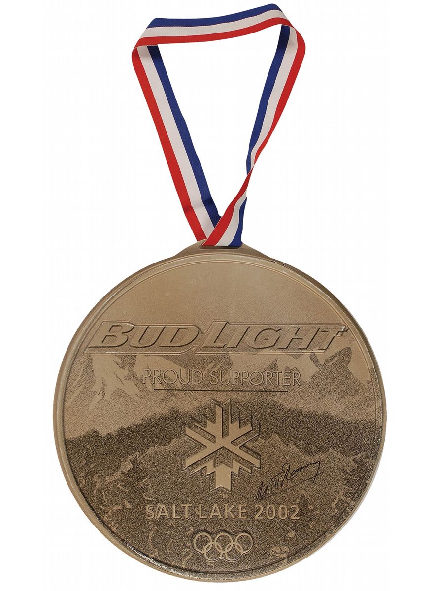 Replica oversized Olympic medal for the 2002 Salt Lake City Winter Olympics, 14.5-inch diameter, bearing an advertisment for Bud Light, signed in black felt tip by Romney. Some cracking to the plastic on the right edge, otherwise fine condition. Scarce in that it is unusual for Romney to sign breweriana.
