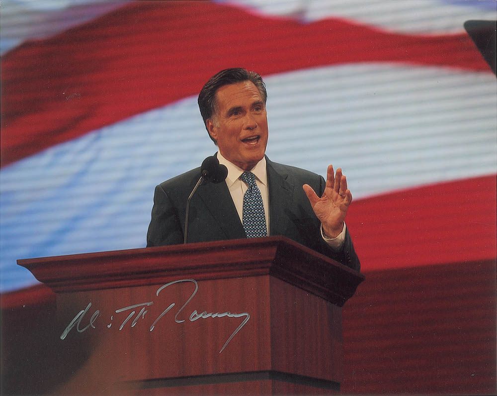 Color satin-finish 10 x 8 photo of Romney making a speech, signed in silver ink. In fine condition.
