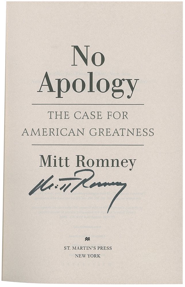 Signed book: No Apology. First edition, first printing. NY: St. Martin's Press, 2010. Hardcover with dustjacket, 6.5 x 9.5, 323 pages. Signed on the title page in black felt tip. In fine condition. Accompanied by a certificate of authenticity from James Spence.