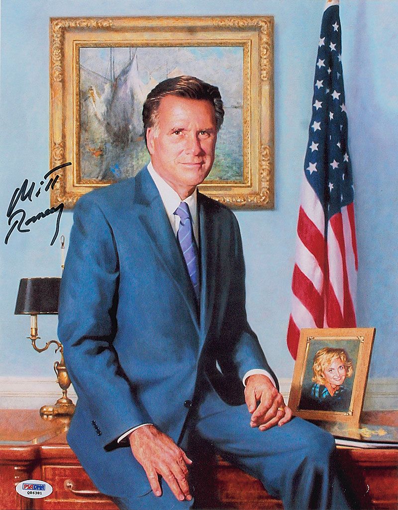 Color satin-finish 11 x 14 photo of Romney’s official portrait from his time as governor of Massachusetts, signed in black felt tip. In very fine condition, with a PSA/DNA label affixed to the lower left corner. Accompanied by a certificate of authenticity from PSA/DNA.