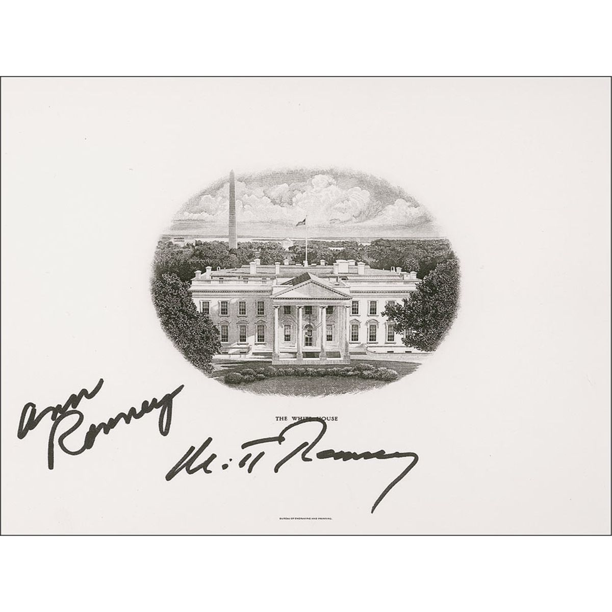 Engraved portrait of the White House, 8 x 6, by the Bureau of Engraving and Printing, signed in black felt tip by Mitt and Ann Romney. In very fine condition.