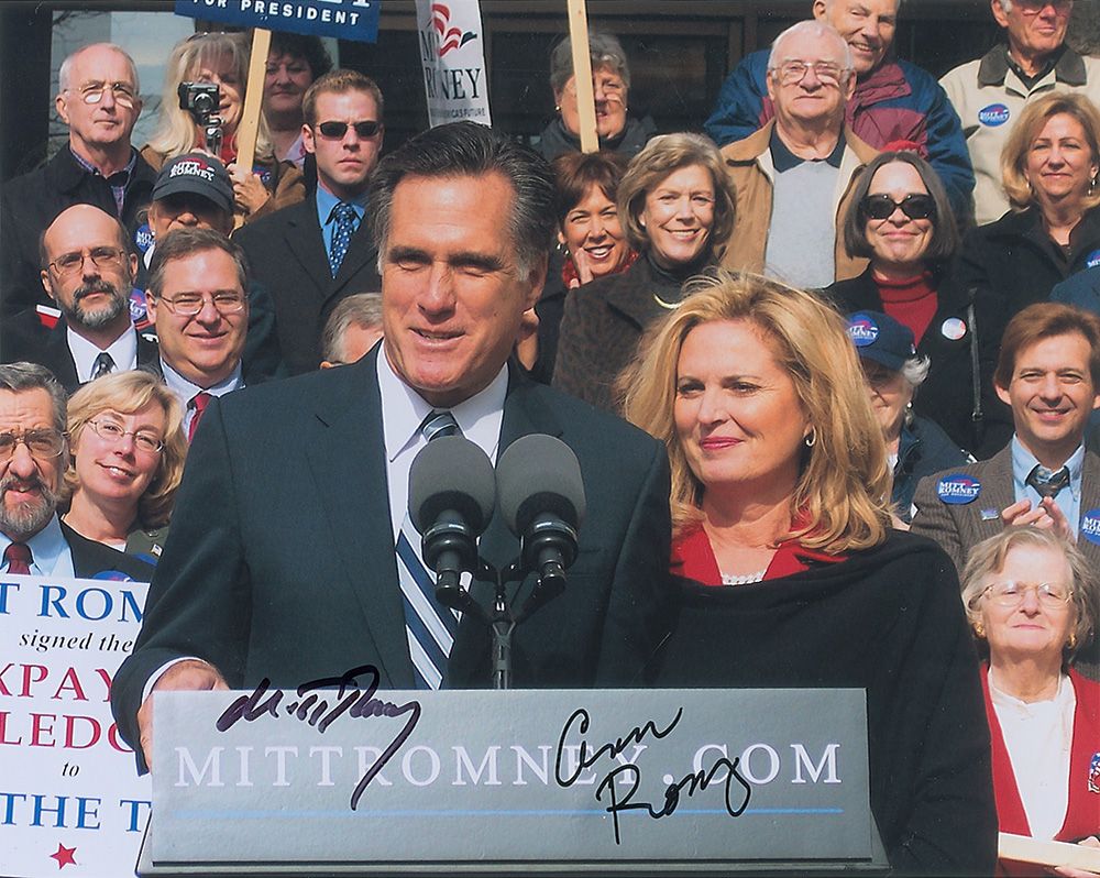 Color glossy 10 x 8 photo of the Romneys campaigning, signed in black felt tip by both. In fine condition.