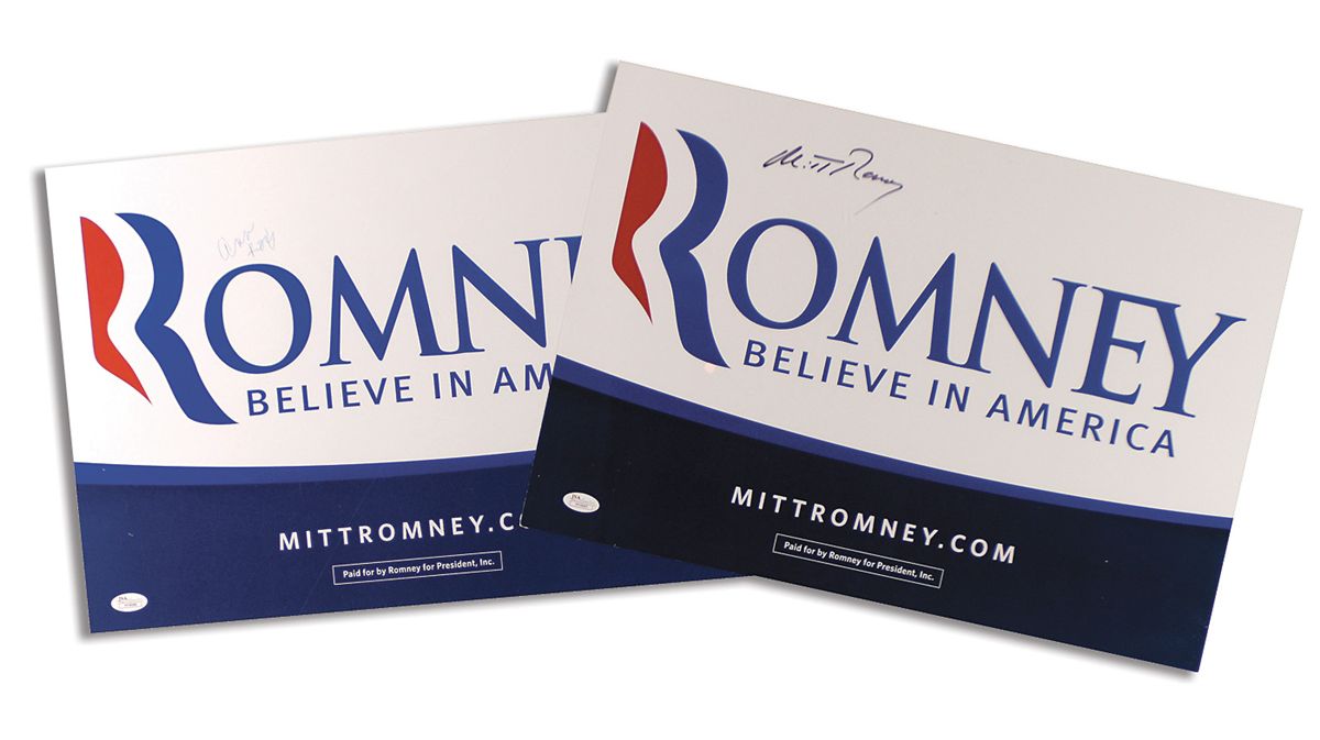Two color 19 x 13 ‘Believe in America’ campaign posters, one signed in black felt tip by Mitt Romney and one signed in blue ballpoint by Ann Romney. In fine condition, with a few light dings and creases, and JSA authentication labels affixed to both. Both posters are accompanied by a certificate of authenticity from JSA.